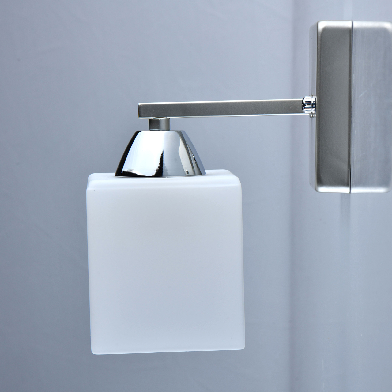 Геометрические формы основания поддержаны кубической формой плафона Актуальная комбинация металлов цвета перламутрового серебра и глянцевого хромаПлафон матового белого стекла создает мягкое освещениеПолная семья из бра, светильников на 4 и 8 ламп