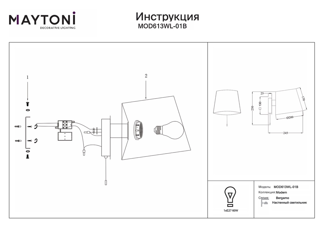 Бра Maytoni Bergamo MOD613WL-01B — это модель, которая максимально функциональна. Благодаря источнику света с типом цоколя E27 и мощностью 60 Вт, этот осветительный прибор обеспечивает комфортное и равномерное освещение на площади в 3 квадратных метра, создавая уютную атмосферу в вашем доме.