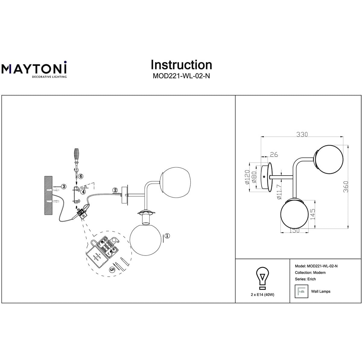 Бра Maytoni Erich MOD221-WL-02-N, входящая в коллекцию Modern, отлично подойдет для освещения пространства в гостиной, в спальне, на даче, в кабинете, оформленных в современном стиле или в стиле Хай-тек. Данный артикул имеет два плафона диаметром 15 см белого цвета в форме шара, выполненных из стекла и направленных вниз и в сторону, а также матовую никелированную арматуру, при этом глубина расположения светильника от стены равна 33 см. Немецкий производитель Maytoni дает гарантию на свое изделие 2 года и рекомендует использовать для устройства энергосберегающие лампы или лампы накаливания с цоколем Е14 по 40 Вт каждая и общей мощностью 80 Вт, что позволяет осветить помещение площадью 4,4 кв. м. Способ крепления светильника к стене на планку позволяет быстро и просто осуществить монтаж. Стильный дизайн и матовая поверхность плафонов бра Maytoni Erich MOD221-WL-02-N делают ее особенным элементом декора, который украсит любое интерьерное пространство.