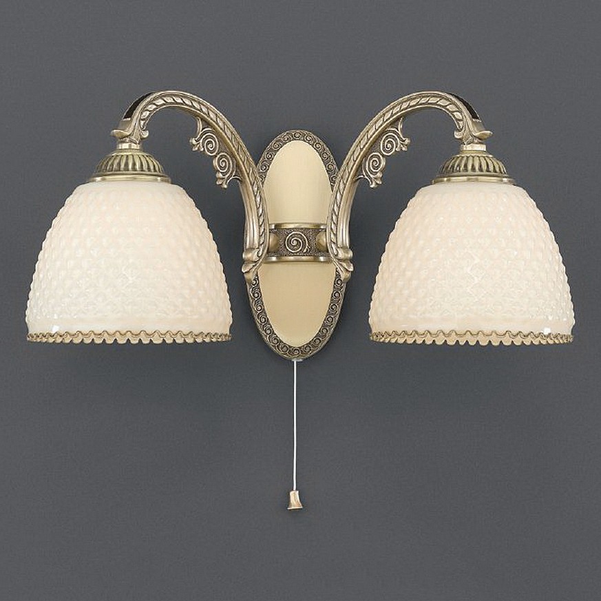 Бра Reccagni Angelo A 7005/2 Итальянского производсва – уникальное сочетание высокого качества и удивительных фактур. Этот светильник Классического стиля хорошо подойдет Для гостиной и придаст помещению мягкий и приятный свет. Плафоны белые из стекла. Арматура бронза из металла. Кол-во ламп - 2шт. Общая мощность 120W
