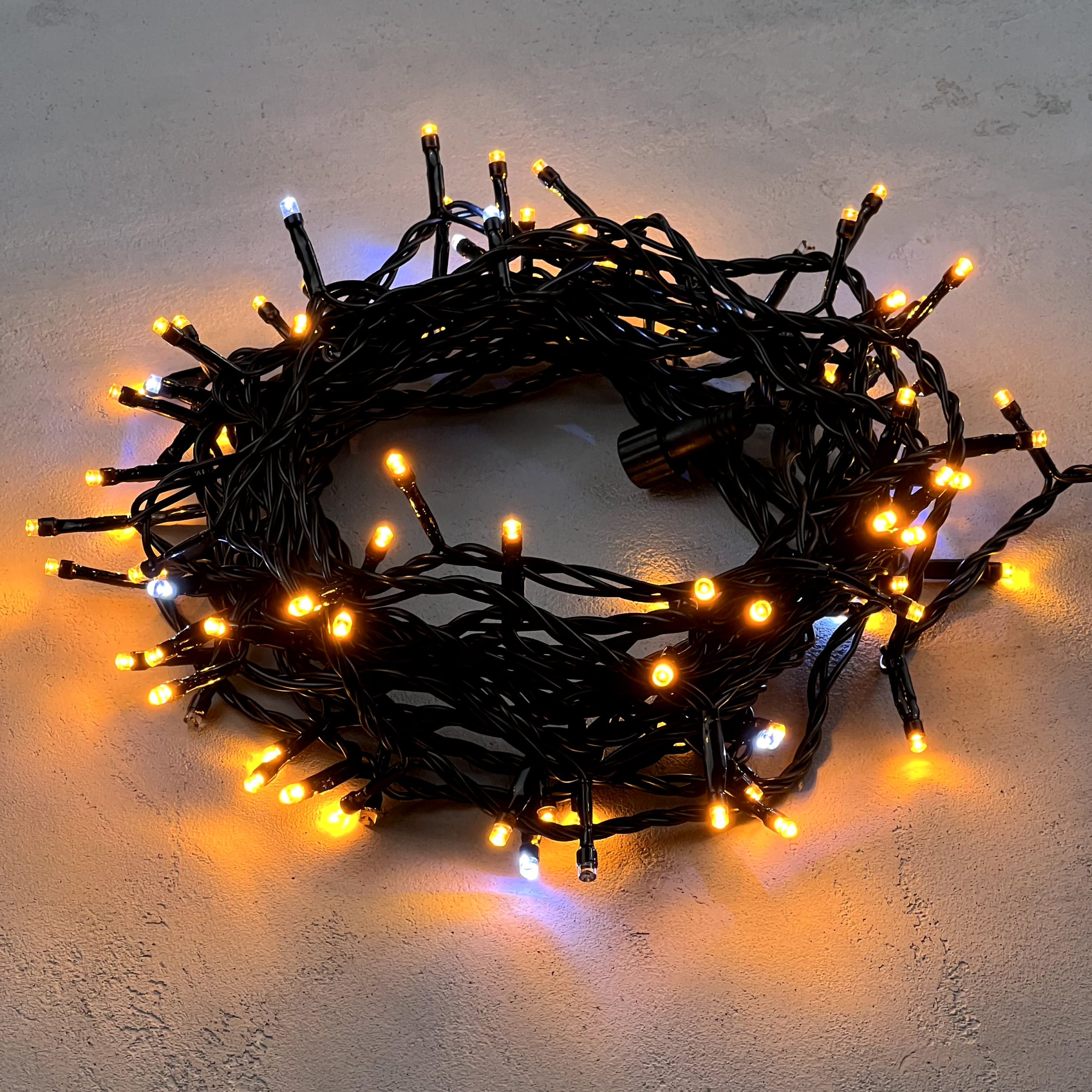 Купить "Гирлянда Нить 10м Желтая с Мерцанием Белого Диода 24В, 100 LED, Провод Черный ПВХ, IP54 LTC PST100BLW-11-1Y"