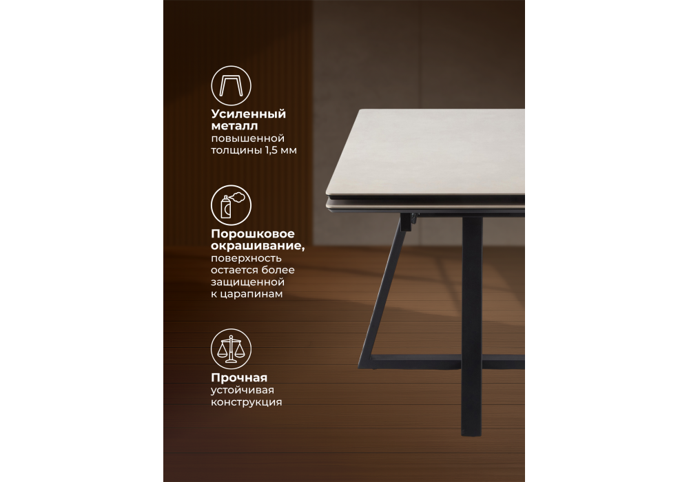 Материал каркаса - металл; Материал столешницы - Керамика; Цвет ножек - черный; Ширина - 80; Высота - 75; Длина стола в разложенном виде - 200; Длина - 140;