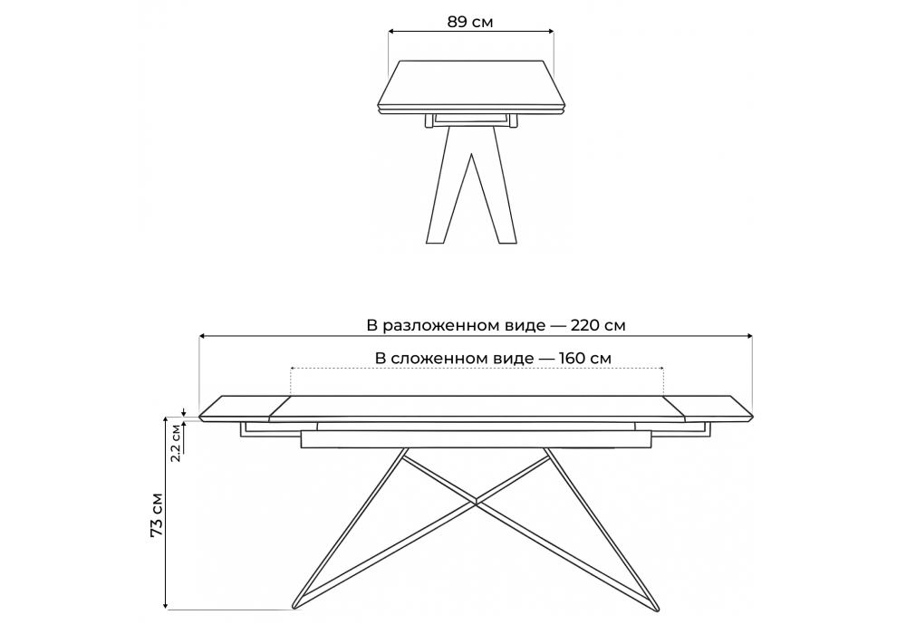Материал каркаса - металл; Материал столешницы - Керамика; Ширина - 89; Высота - 73; Длина стола в разложенном виде - 220; Длина - 160;