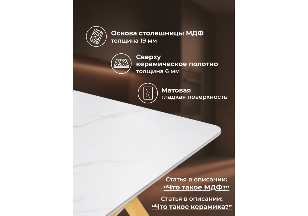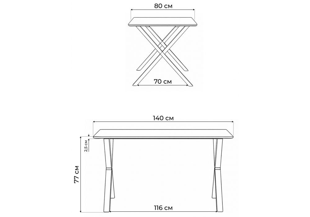 Толщина столешницы: 2,5 см. Материал каркаса - металл; Материал столешницы - Керамика; Ширина - 80; Высота - 77; Длина - 140;