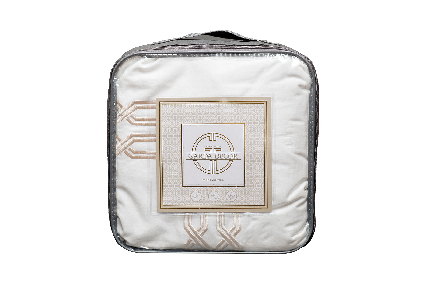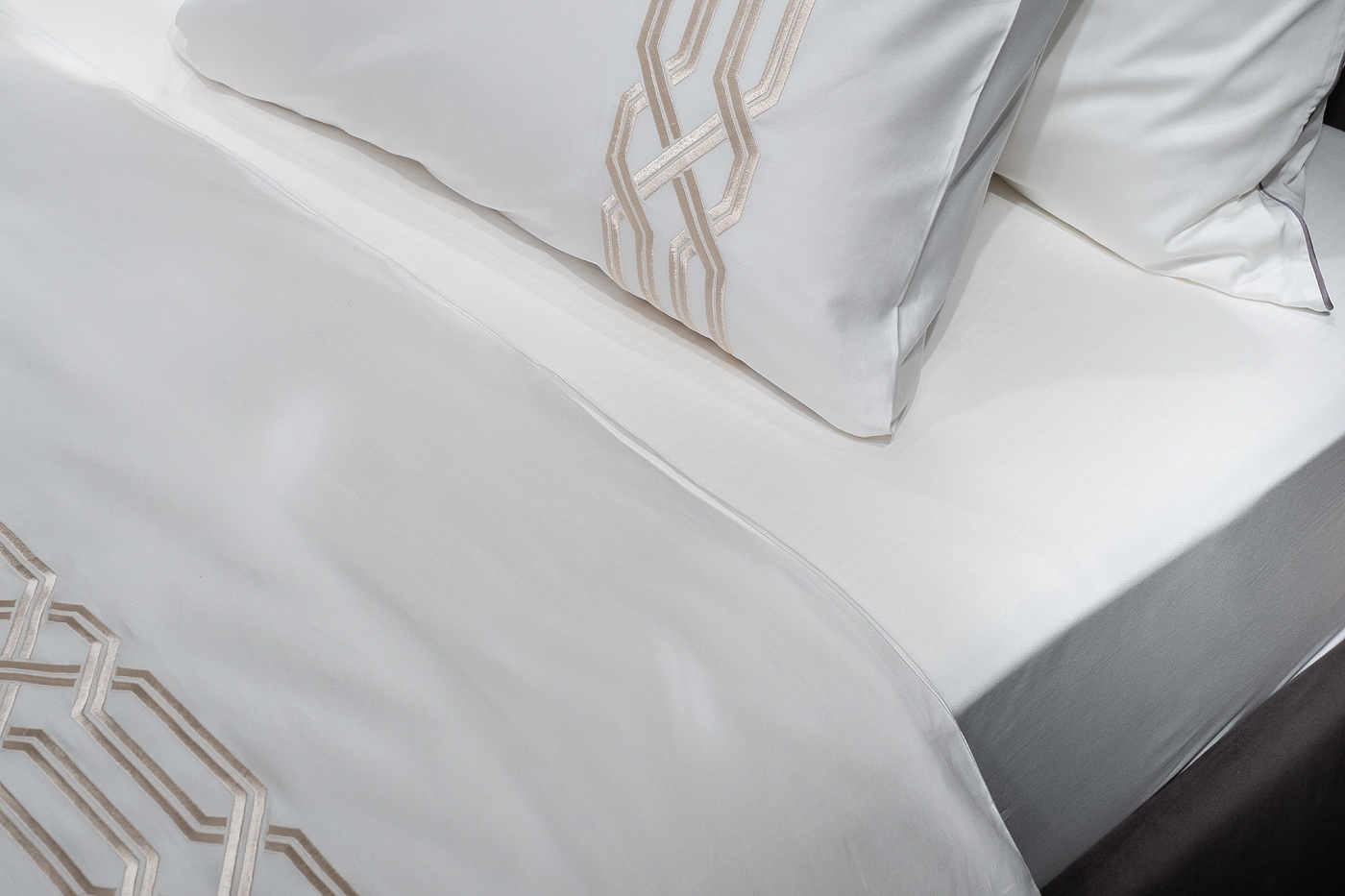 Классический комплект «Паллада» изготовлен из 100% хлопка-сатина высокой плотности 400ТС. Белое белье украшает изящная золотистая вышивка, которая обрамляет пододеяльник по периметру, а на наволочках представлен только с одной стороны. Модель привлекает внимание красивым контрастом между белой тканью и орнаментом оттенка античного золота. Вышивка на постельном белье - дорогой элемент, который придает белью более выраженный вид, создавая объем и, подчеркивая, ценность постельного белья. Оригинальная геометрия орнамента подойдет и для современного интерьера, и для эффектного стиля ар-деко, и для классического дизайна.В данный комплект входят: Пододеяльник 145*210-2шт, наволочка 50*70-2шт и простыня 270*280. Уход: Машинная стирка при максимальной температуре 40С, мягкий режим. Стирать моющими средствами для цветных тканей. Не отбеливать. Барабанная сушка возможна, обычная температура. Гладить с изнаночной стороны при максимальной температуре утюга. Сухая химчистка запрещена.