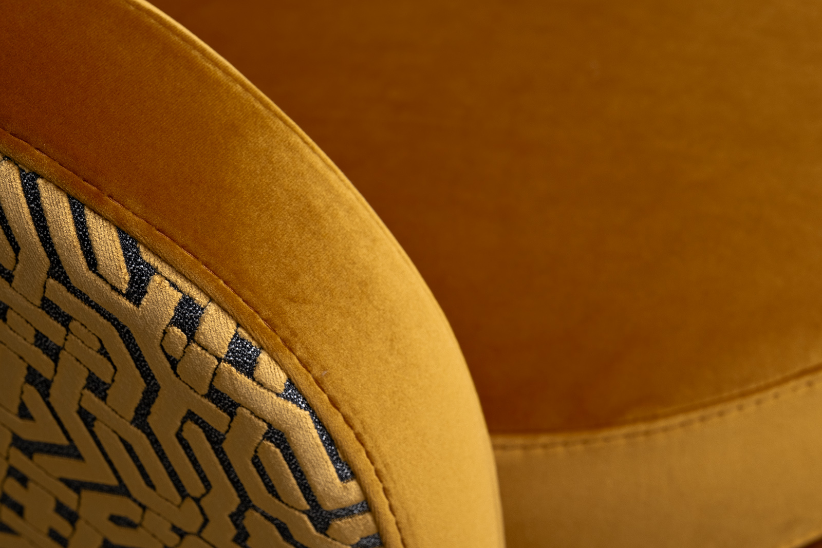 В стандартном исполнении: обивка в ткани велюр Paddington31r - внутренняя часть кресла, внешняя сторона спинки вельвет из коллекции Garda Decor- Lattice ORANG, основание - матовое золото, без декоративной подушки.