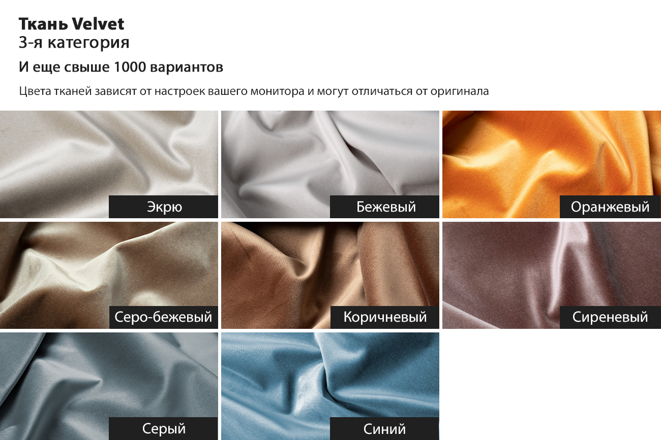 Материалы: обивка - вельвет(100% полиэстер/ 52% полиэстер, 48% вискоза), каркас - дерево, основание - металл . Цвет на заказ