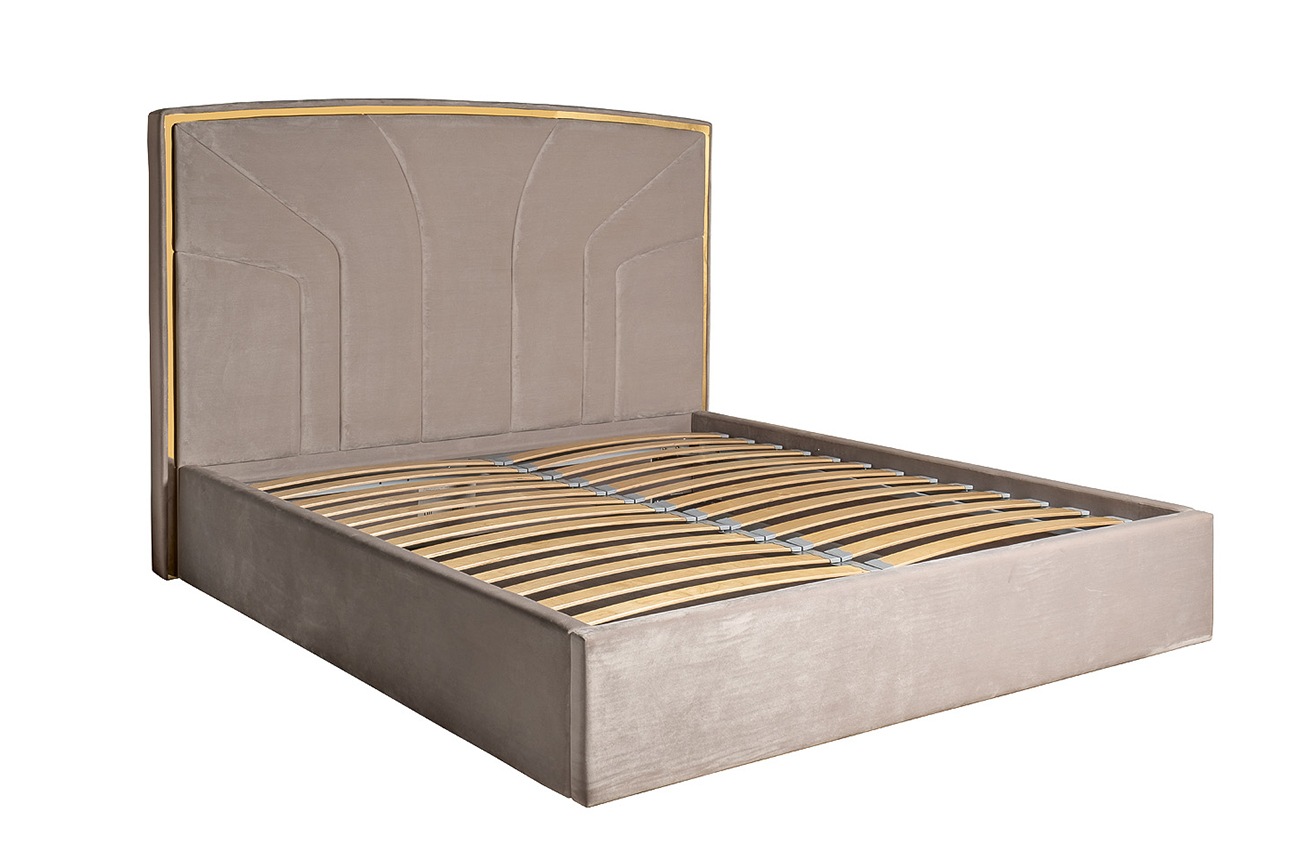 Стильная кровать с лаконичным дизайном в виде расходящихся от центра к краям лучей настраивает на спокойствие и уравновешенность. Мягкий велюр жемчужно-серого оттенка сочетается с золотистым металлическим контуром изголовья, придающим элемент законченности.