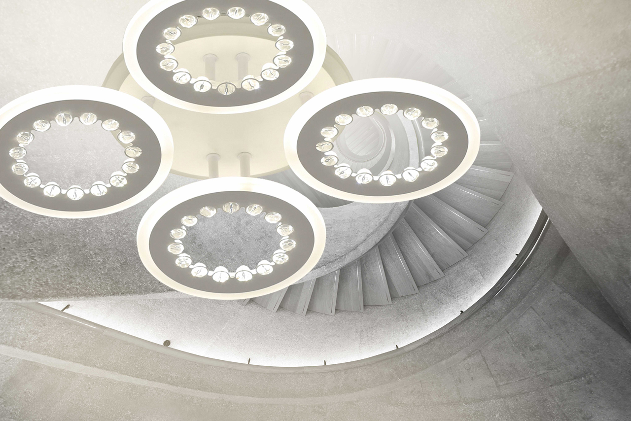 Металлическое основание и плафоны потолочной люстры окрашены в белый цвет. Светодиодные источники света закрыты белым матовым акрилом. Потолочная люстра декорирована бусинами из прозрачного акрила. Дополнительно, в светильнике предусмотрена подсветка потолочной чаши. Светильник приходит в состоянии частичной сборки в компактной упаковке: вся электрика подсоединена, достаточно закрепить плафоны на корпусе.
