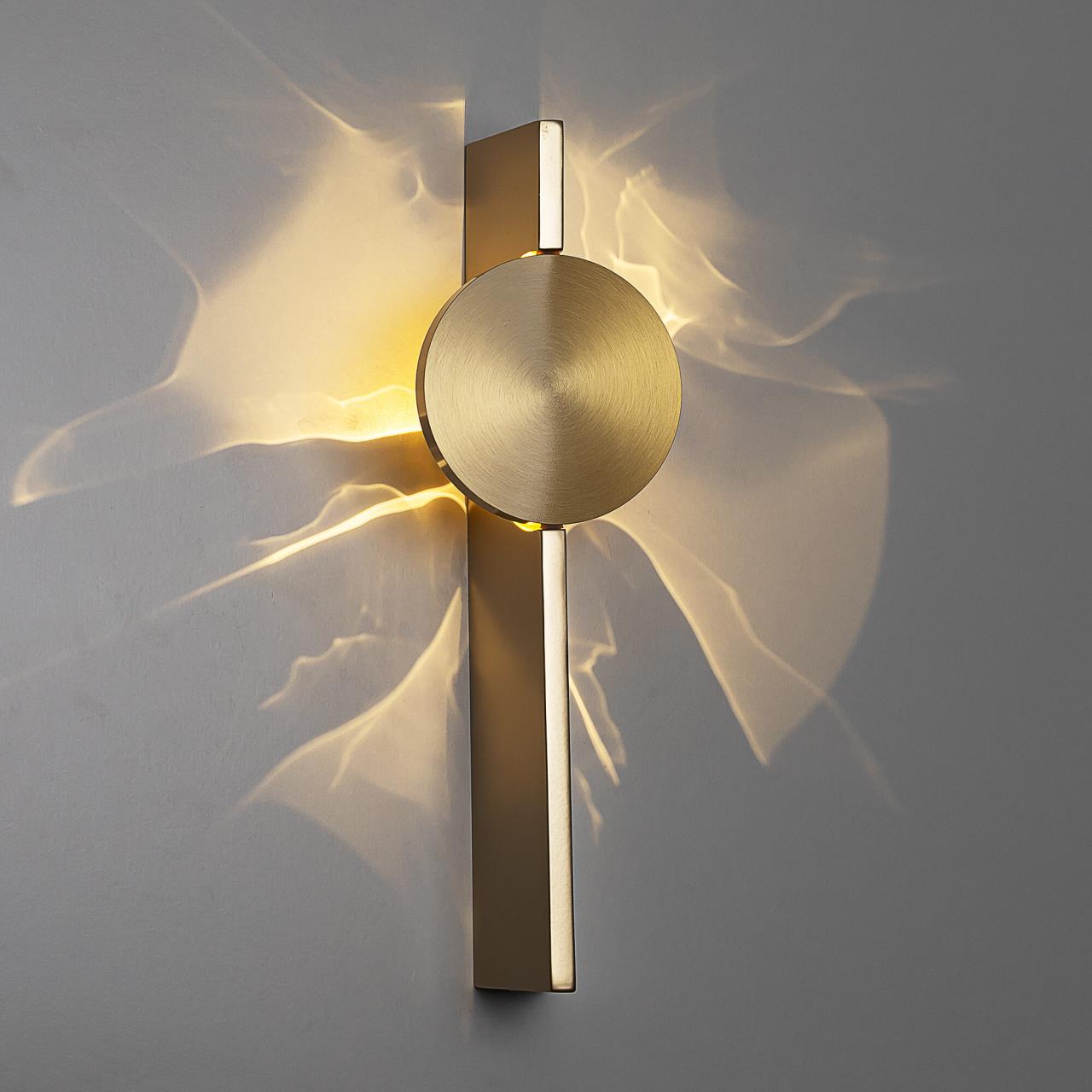 Круглый металлический отражатель оттенка латуни создает интересные световые разводы на стене. Благодаря поворотному механизму вы сможете в любой момент изменить угол освещения, акцентируя внимание на нужных зонах.