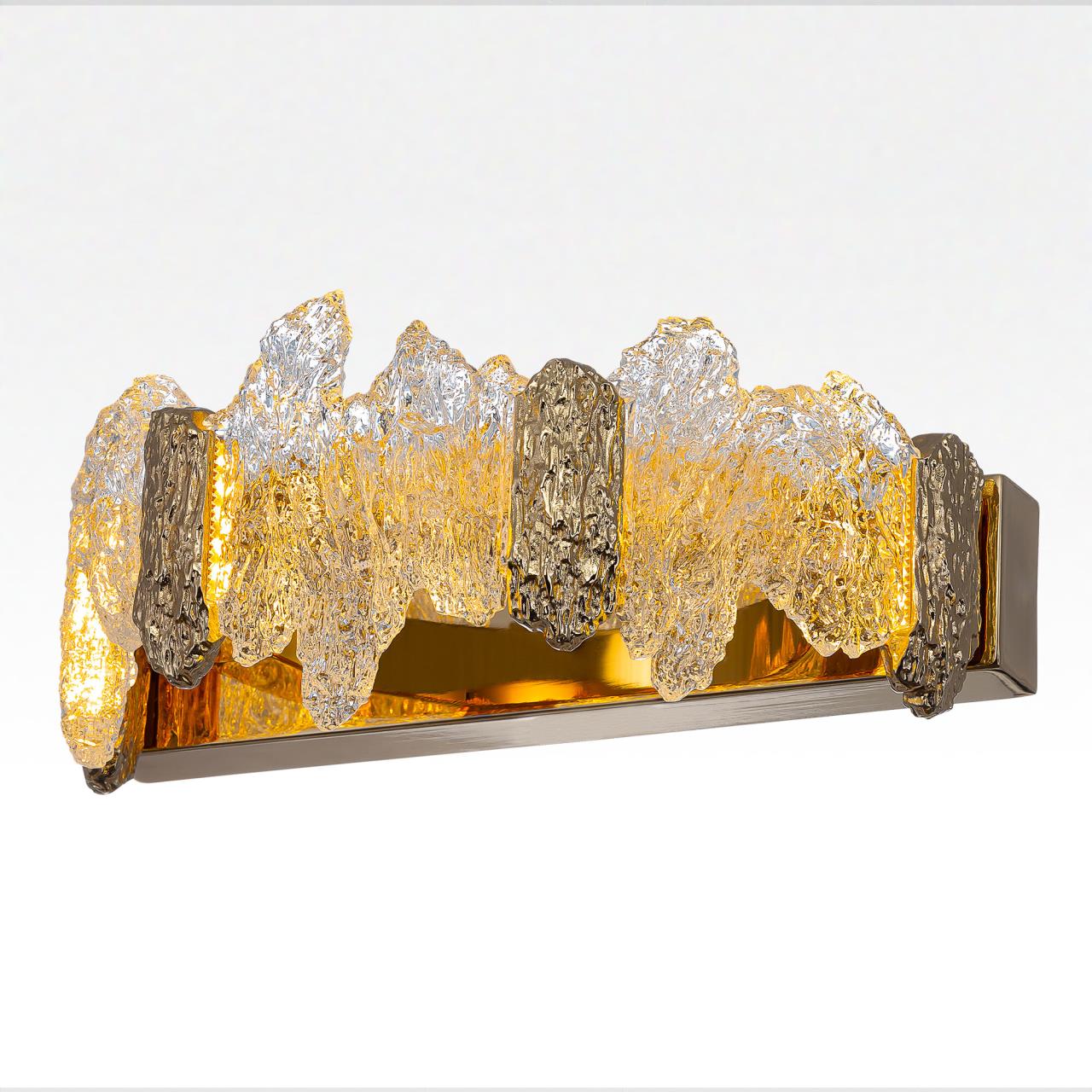 Каркас светильника — металлический, роскошного золотистого оттенка. Рассеиватель из оптического полимера имеет оригинальную форму, напоминающую потоки застывшей лавы. Светильник крепится к стене на планку
