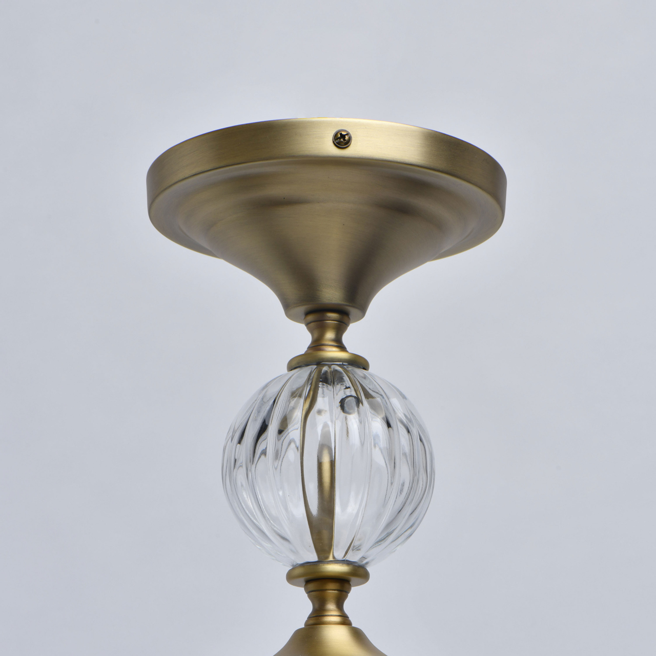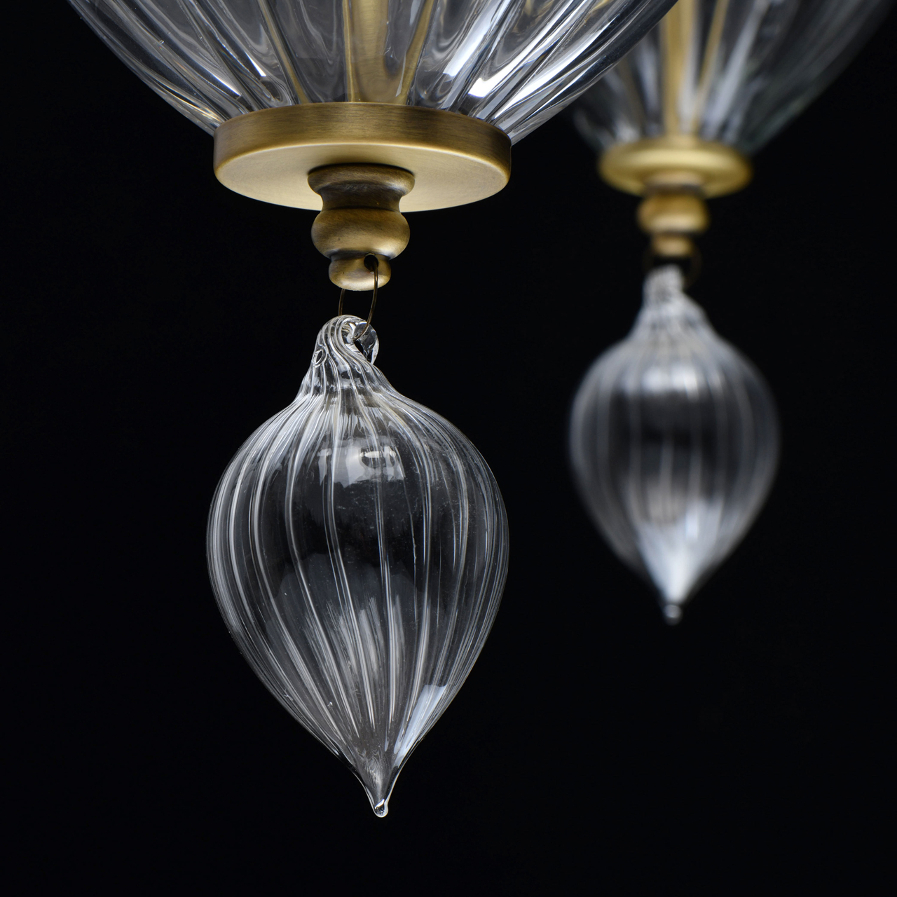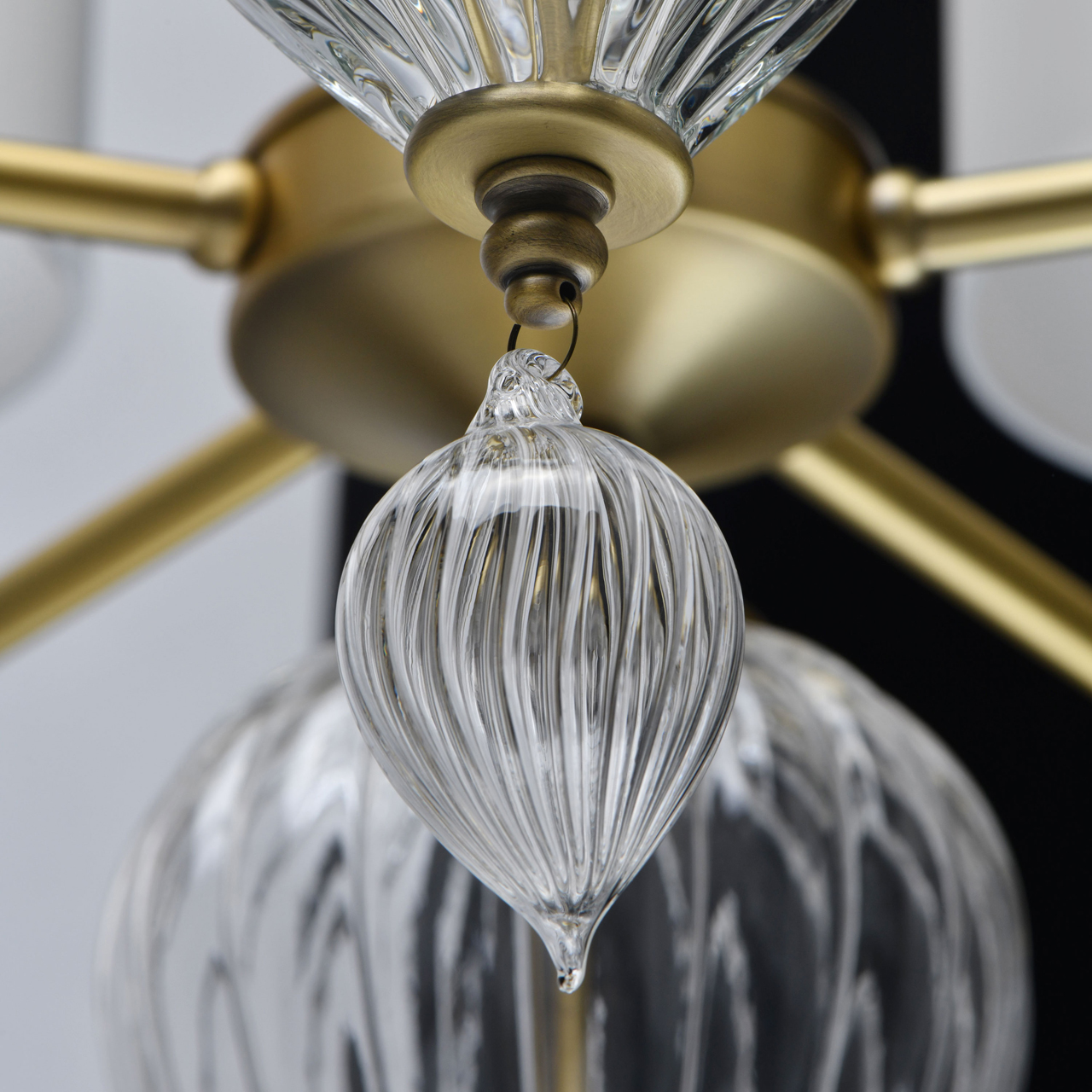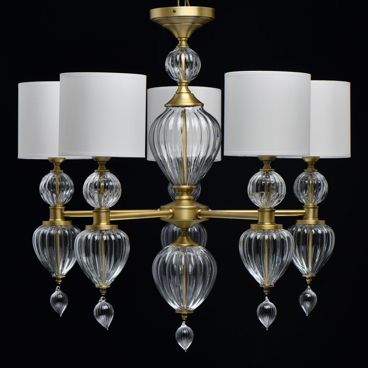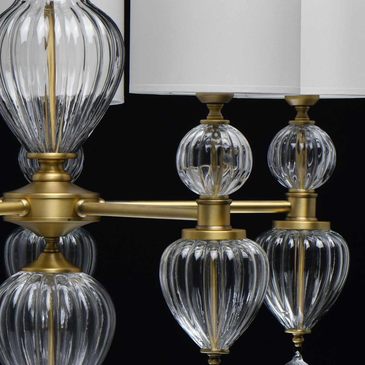Основание светильника выполнено из металла и гальванизировано в цвет латуни. Светильник декорирован выдувным стеклом ручной работы. Текстильные абажуры белого цвета с термостойким акрилом внутри, отделаны кантом и прошиты.