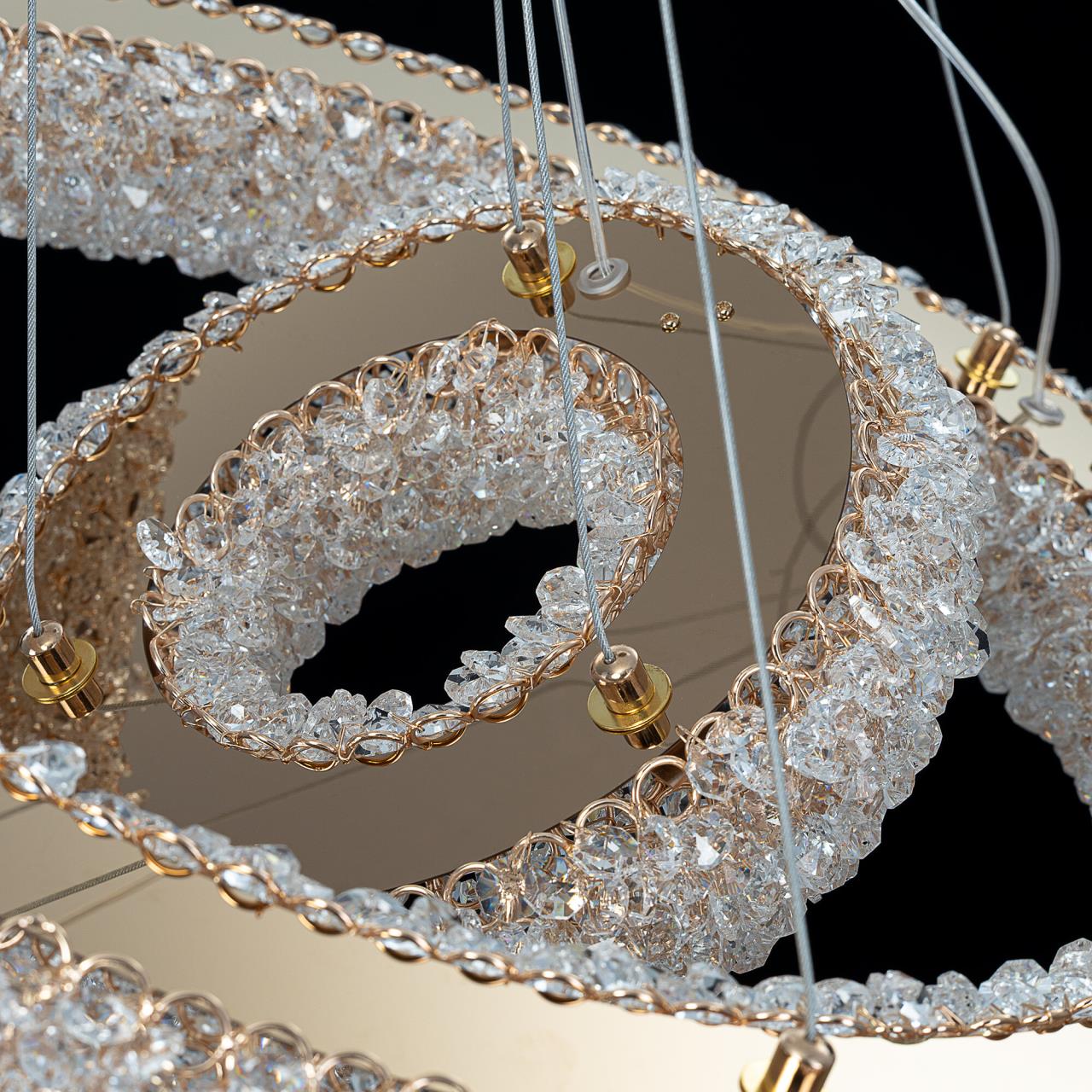 Каркас люстры — металлический, роскошного золотистого цвета. Два подвесных кольца составлены из множества тонких золотых колечек, внутри каждого из них закреплен кристаллик из прозрачного хрусталя. Тонкие подвесные тросы практически незаметны, создавая ощущение, что светильник парит в воздухе.