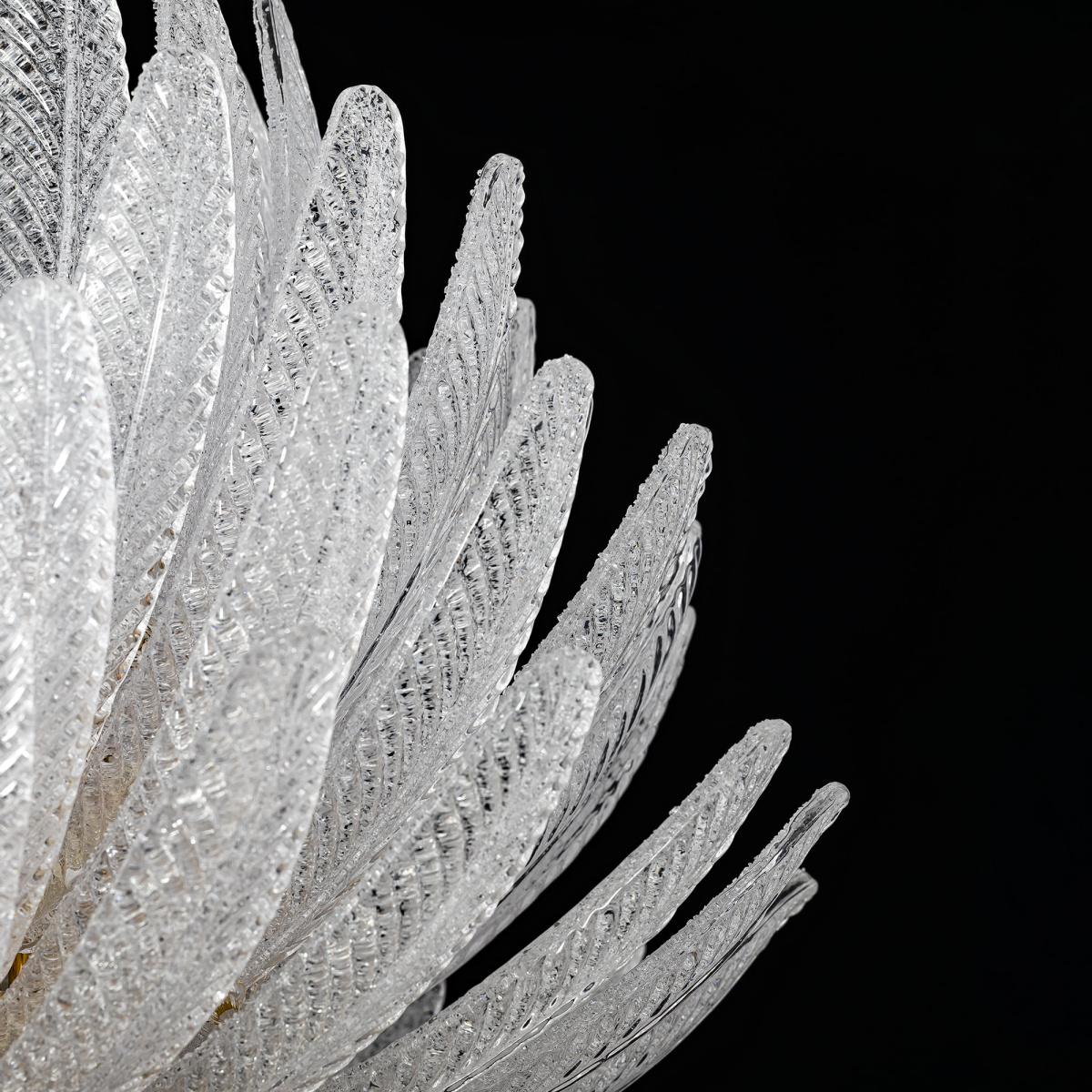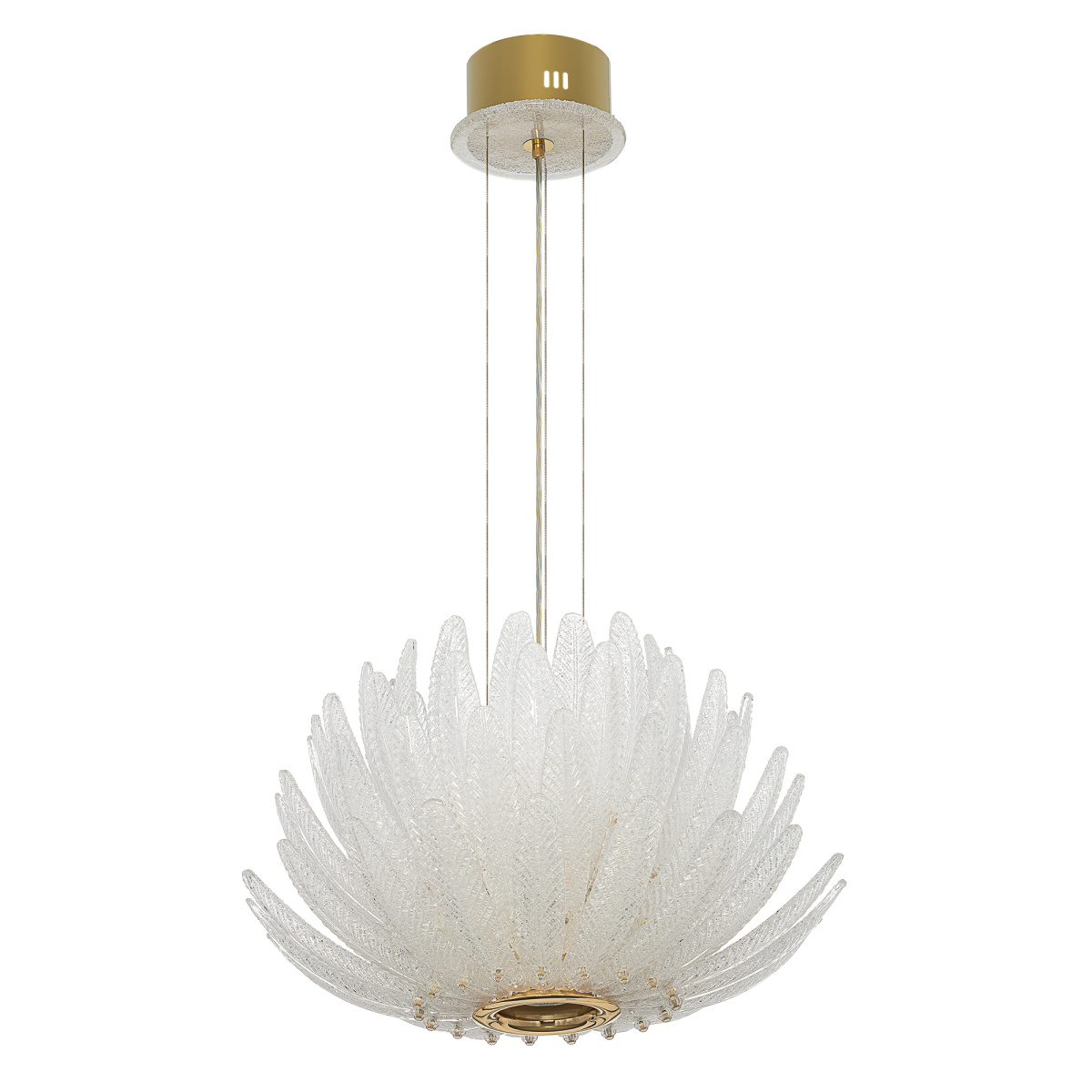 Металлический каркас имеет благородный золотой оттенок, рассеивателем служат несколько рядов полупрозрачных стеклянных текстурных элементов в форме продолговатых листьев. Источником света являются встроенные светодиоды с цветовой температурой 3000К, что соответствует теплому освещению.