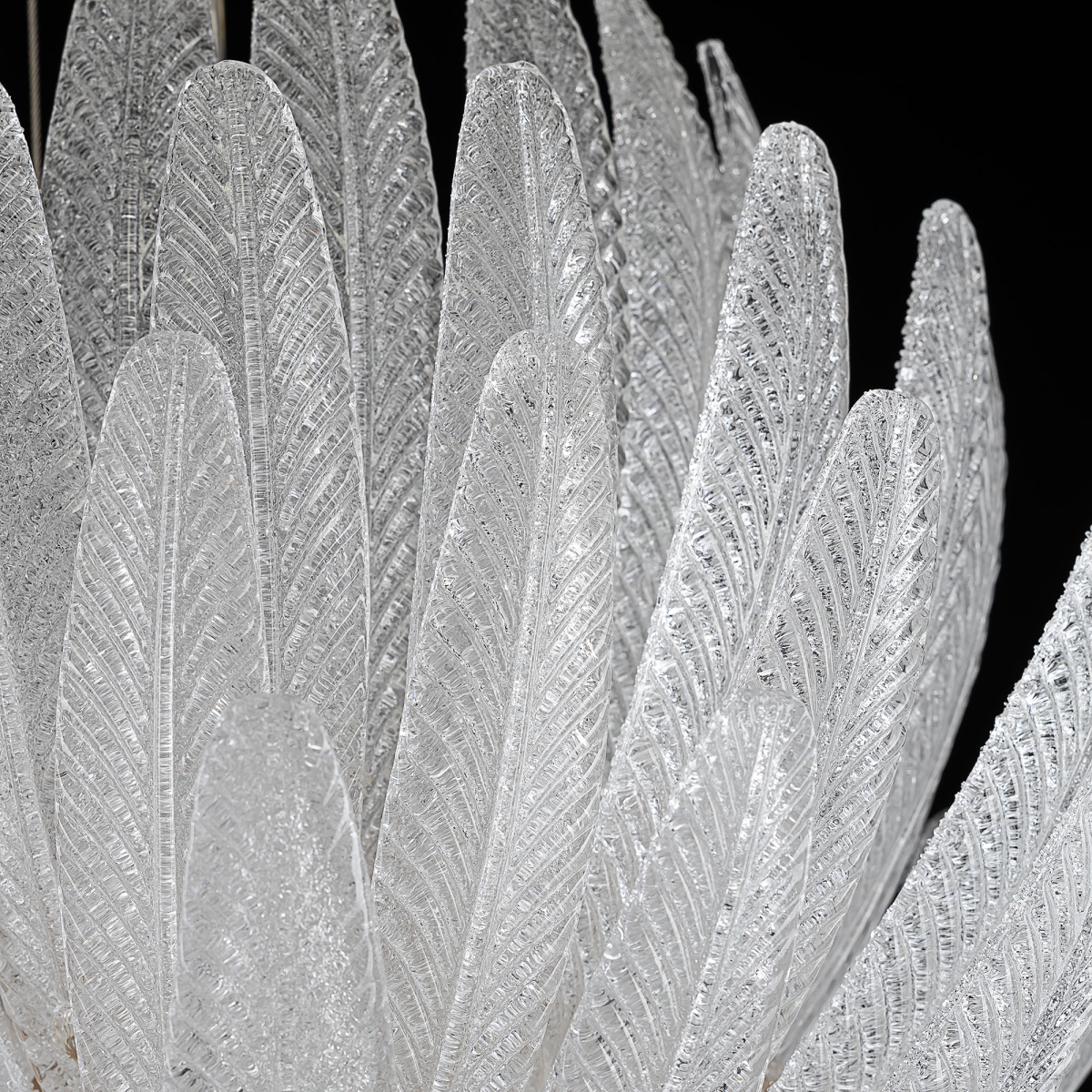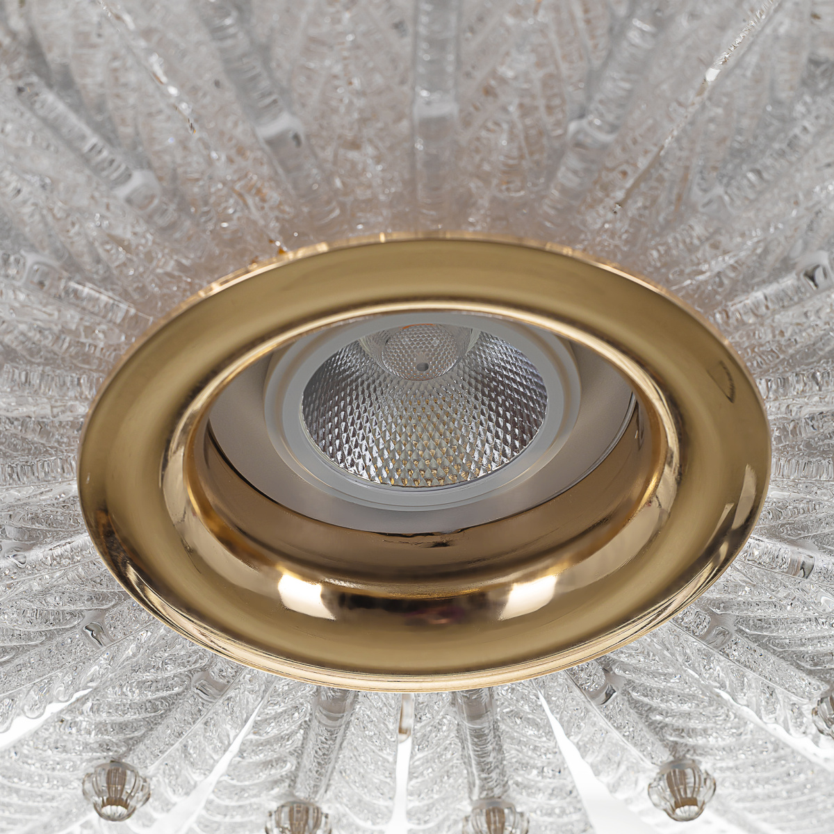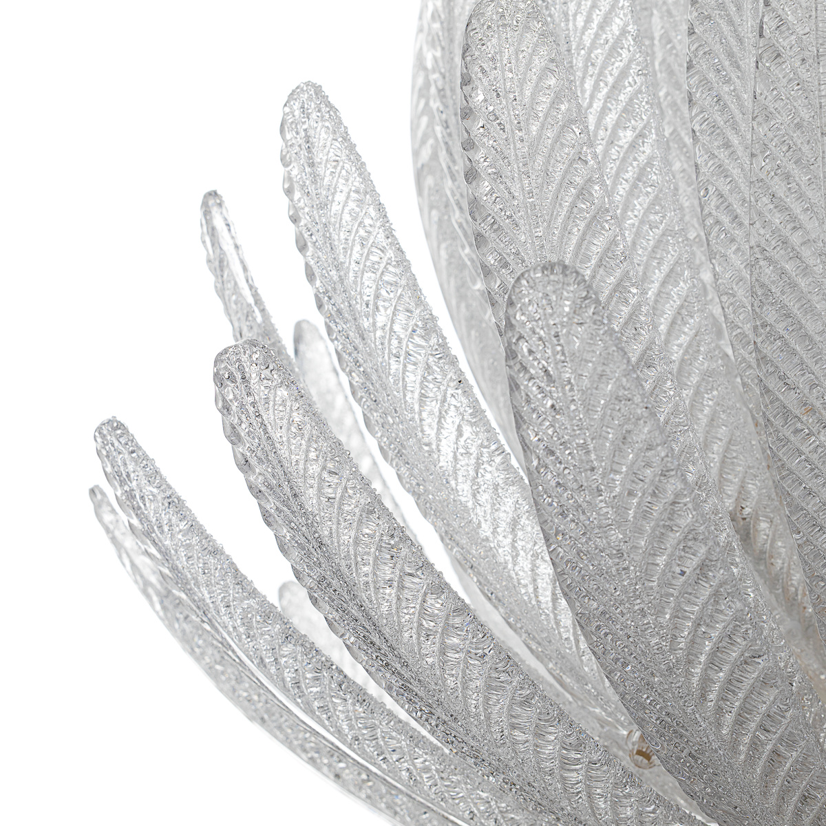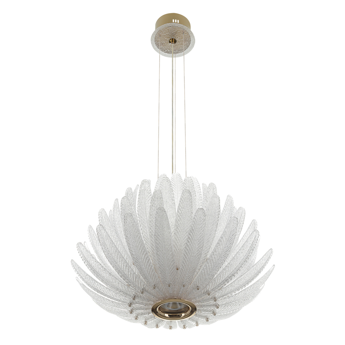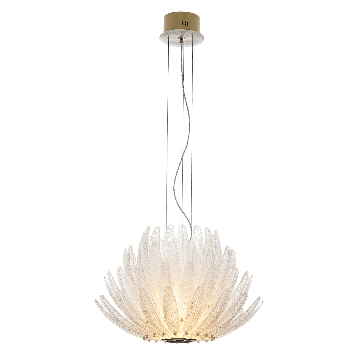 Металлический каркас имеет благородный золотой оттенок, рассеивателем служат несколько рядов полупрозрачных стеклянных текстурных элементов в форме продолговатых листьев. Источником света являются встроенные светодиоды с цветовой температурой 3000К, что соответствует теплому освещению.