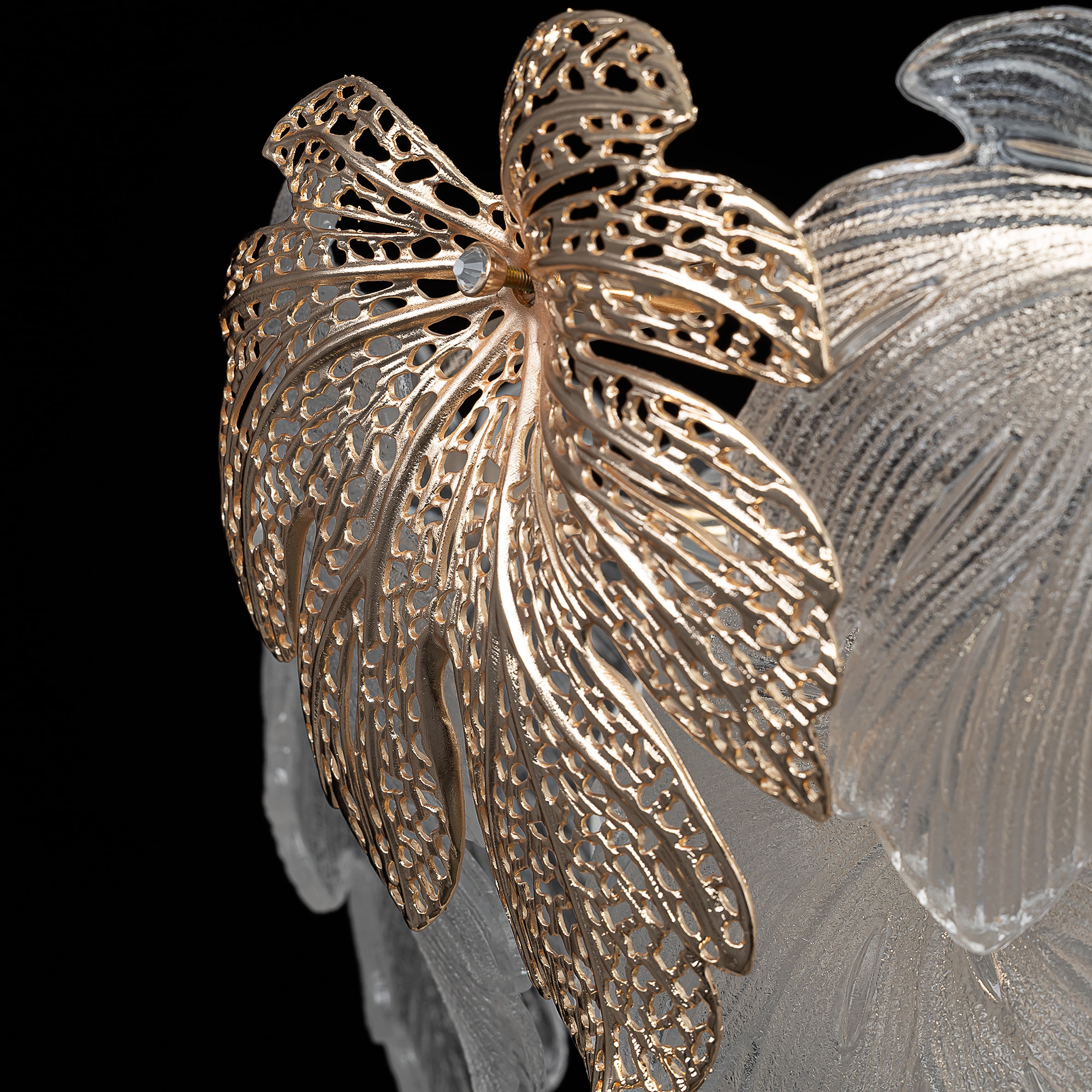 Металлический каркас благородного золотого оттенка дополняют изумительные стеклянные листья, которые формируют утонченный силуэт люстры. В люстре используются 11 лампочек с цоколем E14, максимальная мощность каждой — 60Вт для ламп накаливания. Высота люстры регулируется, ее можно установить на любой потолок, в том числе, и на натяжной.