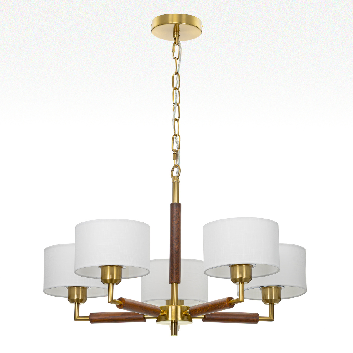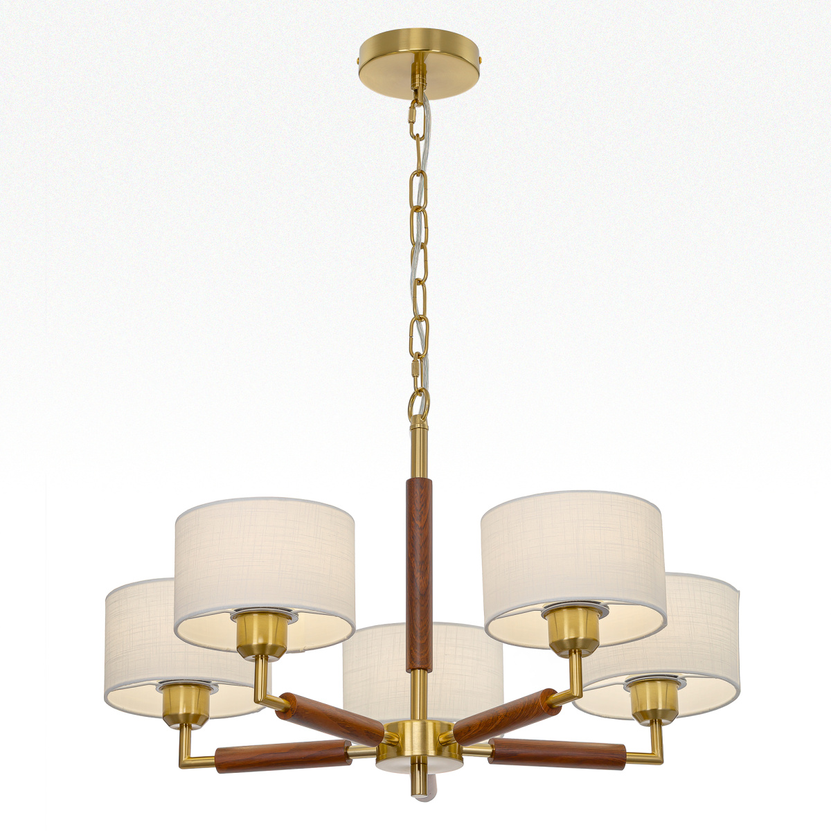 Бронзовый металлический каркас с декоративными элементами с текстурой под дерево. Пять рожков с абажурами в форме цилиндра, изготовленных из молочно-белой ткани с чуть шероховатой текстурой.