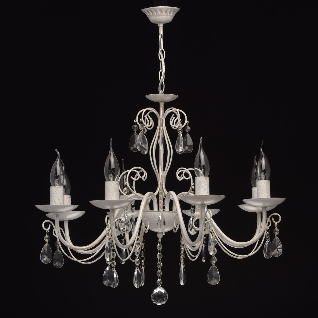 Основание из металла, окрашена по технологии хай-лайт, основной слой белого матового цвета, декоративный слой цвета золота.Декоративные элементы изготовлены из металла по технологии проката на роликовом станке, розетки - технология токарной обработки.Декор: подвески из декоративного прозрачного стекла
