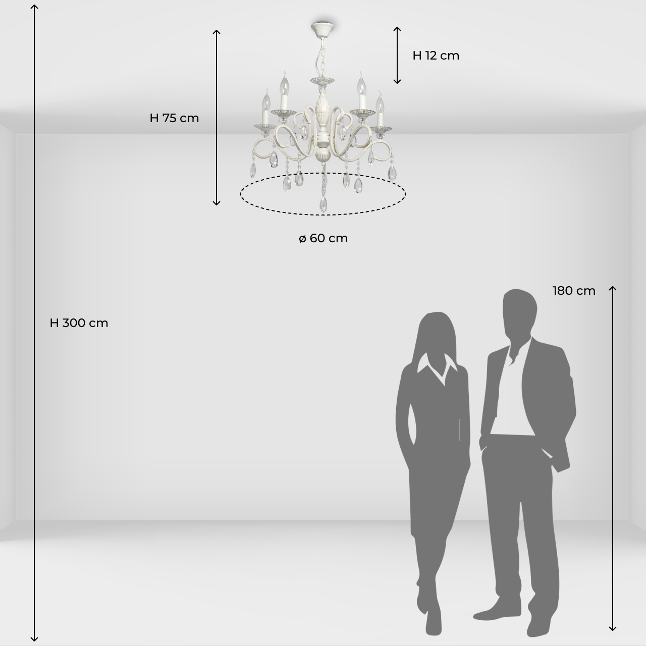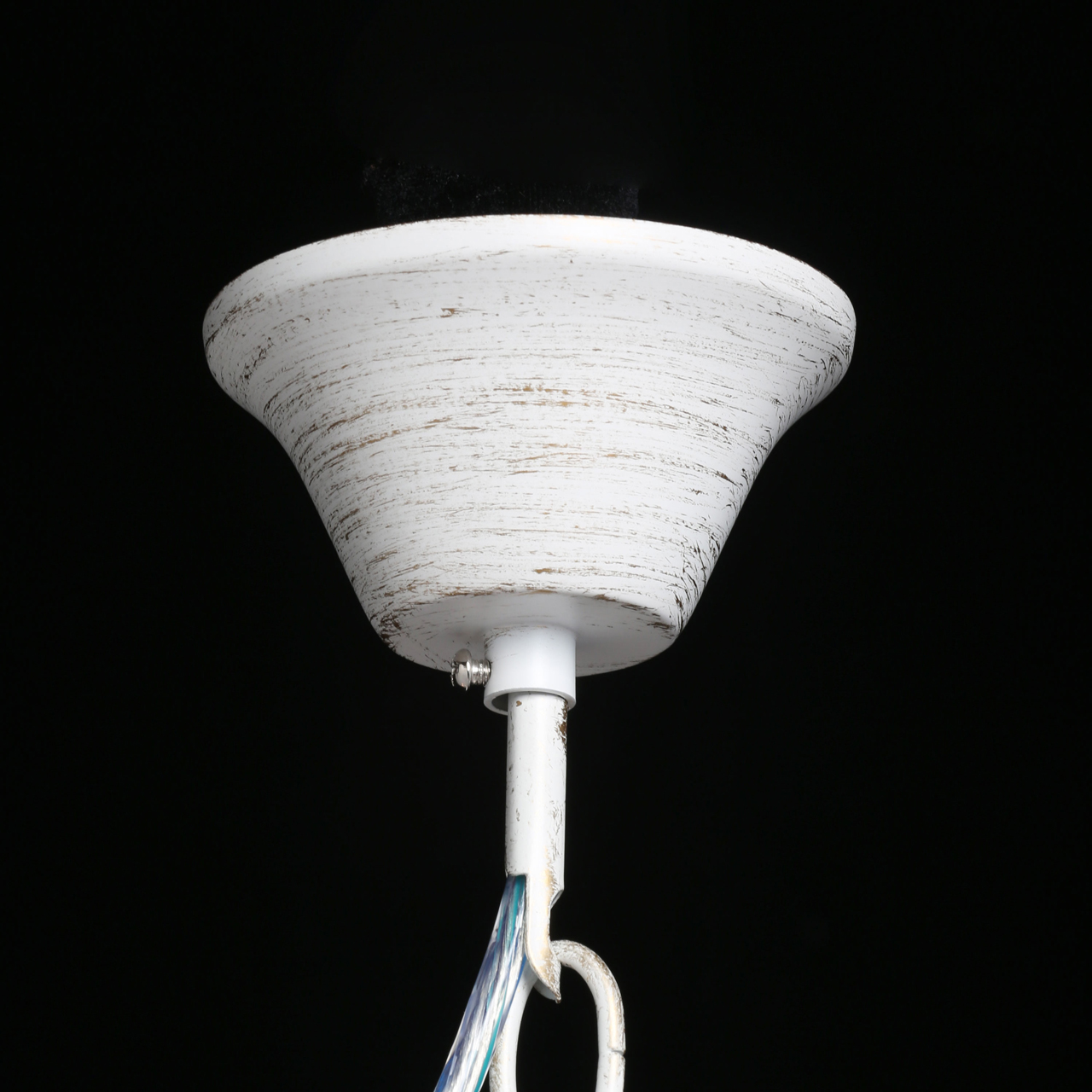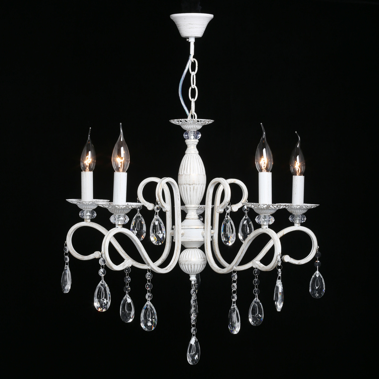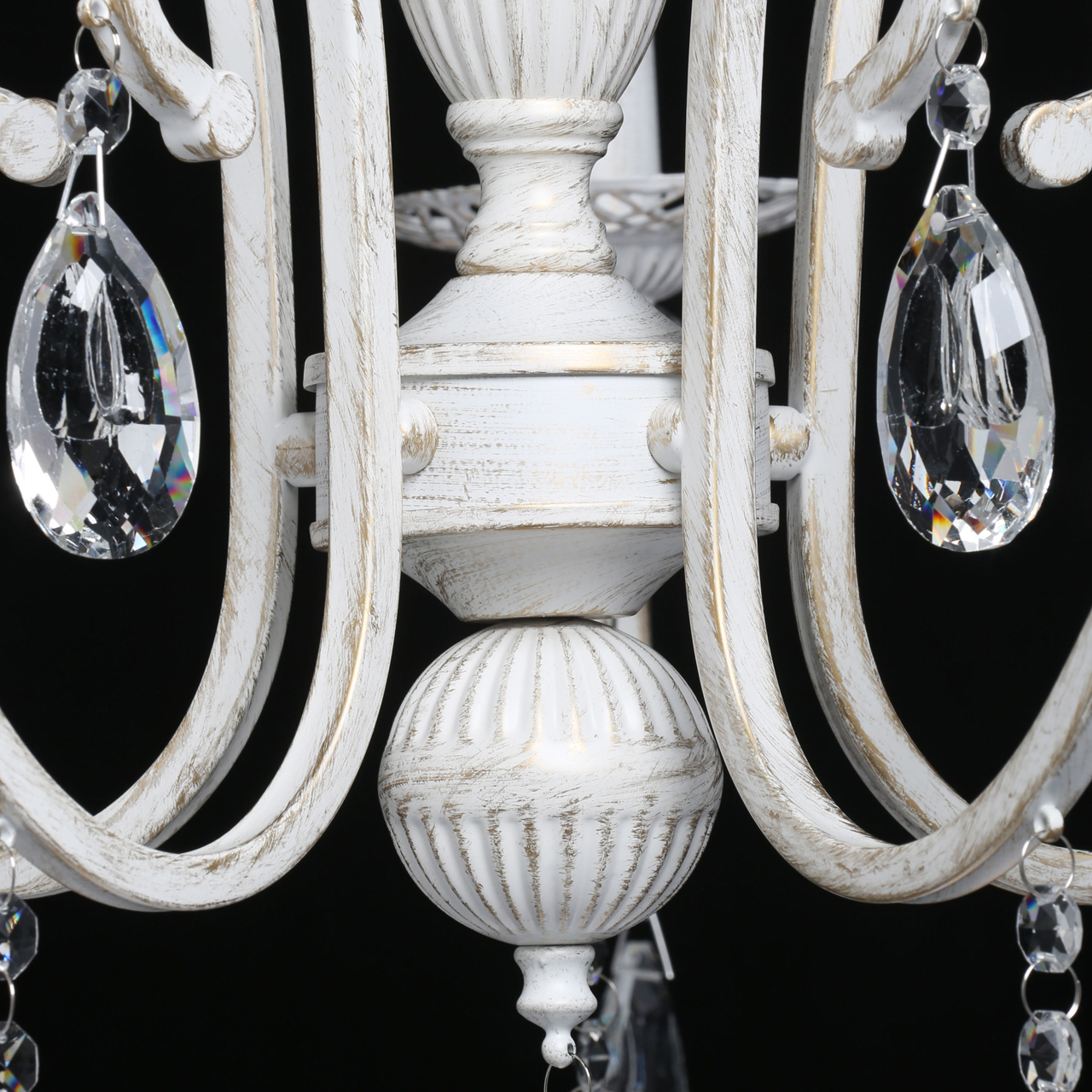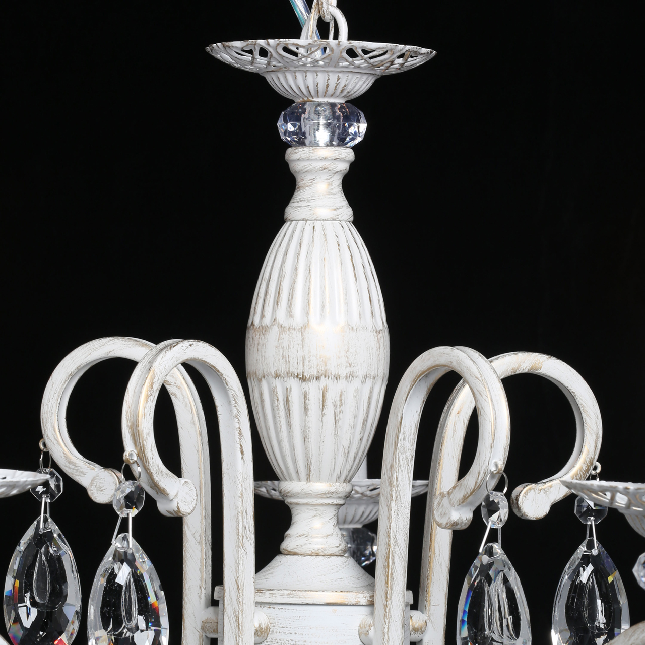Классическая форма рожков-свечей с наборным основанием белого цвета с золотистой патиной.Оригинальная огранка хрустальных подвесок.Декор рожков с резными розетками придает легкости конструкцииВозможность регулировать высоту светильника, убирая лишние звенья цепи