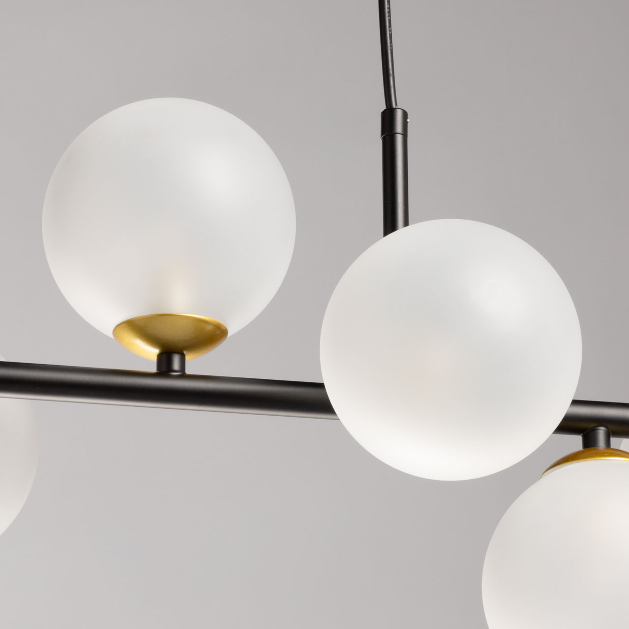 Глубокий черный цвет выгодно выделяет люстру на потолке. Гармоничное сочетание черного и золотого цветов, фактур и форм делает эту люстру ярким акцентом в интерьере. Ассиметричное расположение стеклянных плафонов придает люстре индивидуальность. Матированные плафоны мягко рассеивают свет и создают комфортное освещение. Заменяемые источники света удобны в эксплуатации. Возможность регулировать комфортную высоту.
