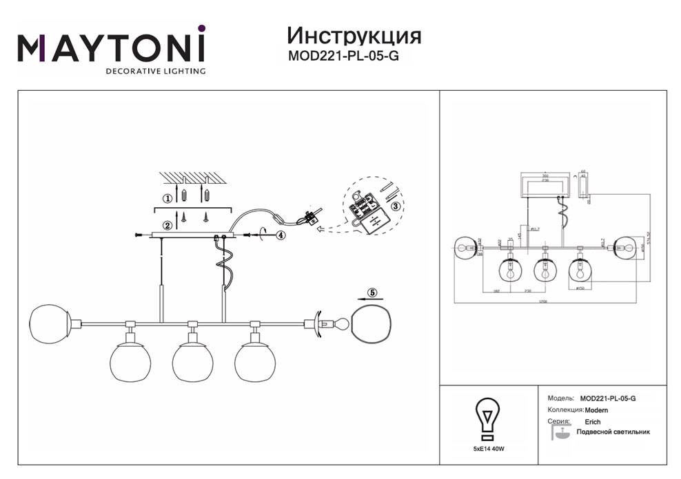 Подвесная люстра Maytoni Erich MOD221-PL-05-G — это надёжный и долговечный осветительный прибор, который станет прекрасным дополнением вашего дома и будет радовать вас своим стильным дизайном и функциональностью на протяжении многих лет.