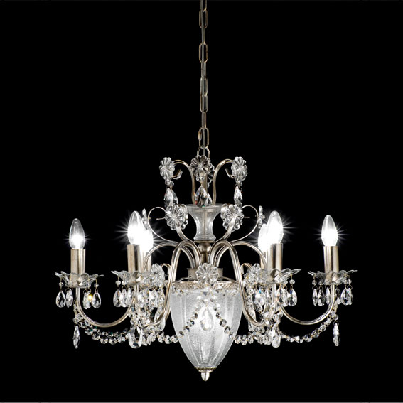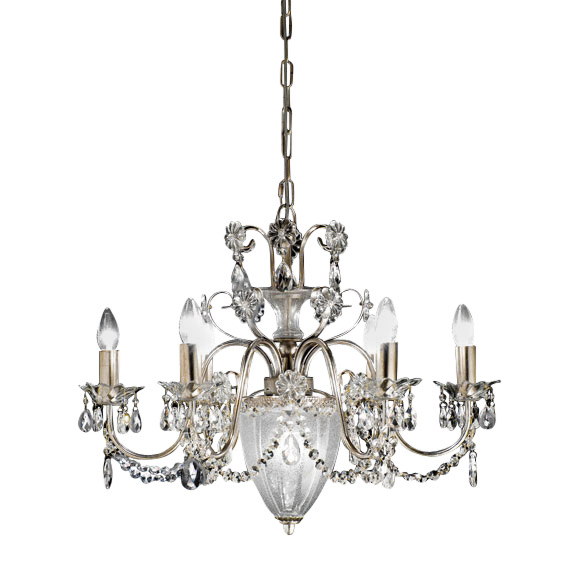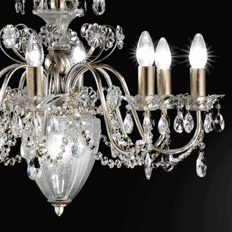 Подвесной светильник серии RUGIADA имеет металлическую основу покрытую фольгированным серебром. Светильник декорирован цепочками и подвесками из прозрачного хрусталя. Центральная часть люстры украшена плафоном из муранского стекла ручной выдувки. Световых элементов семь: шесть открытых и один помещенный в плафон. По индивидуальному заказу возможны различные модификации и варианты отделки. Данную модель 6957/6+1 V1690 спешите купить в интернет-магазине 220svet.