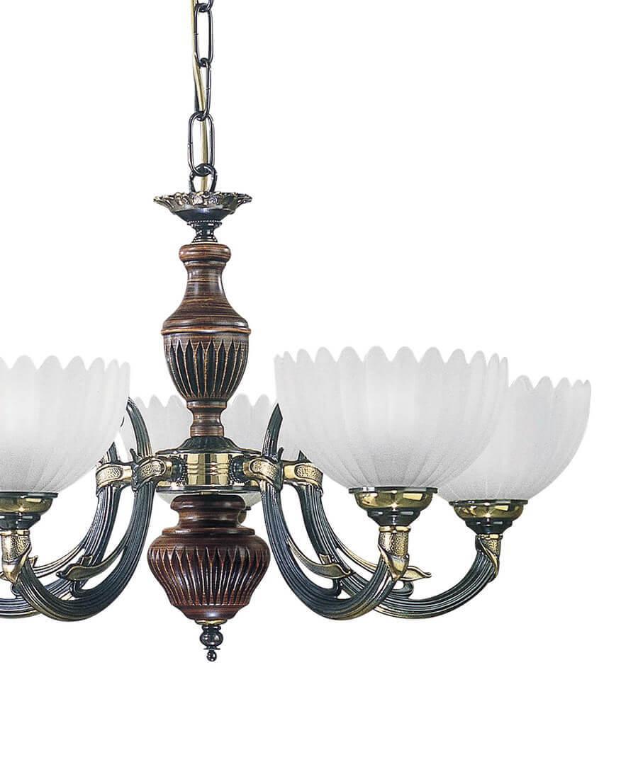 Подвесная люстра Reccagni Angelo L 3610/5 Итальянского производсва – отличный выбор для Вас. Этот светильник Классического стиля хорошо подойдет Для гостиной и придаст помещению мягкий и приятный свет. Плафоны белые из стекла. Арматура бронза из металла. Кол-во ламп - 5шт. Общая мощность 300W