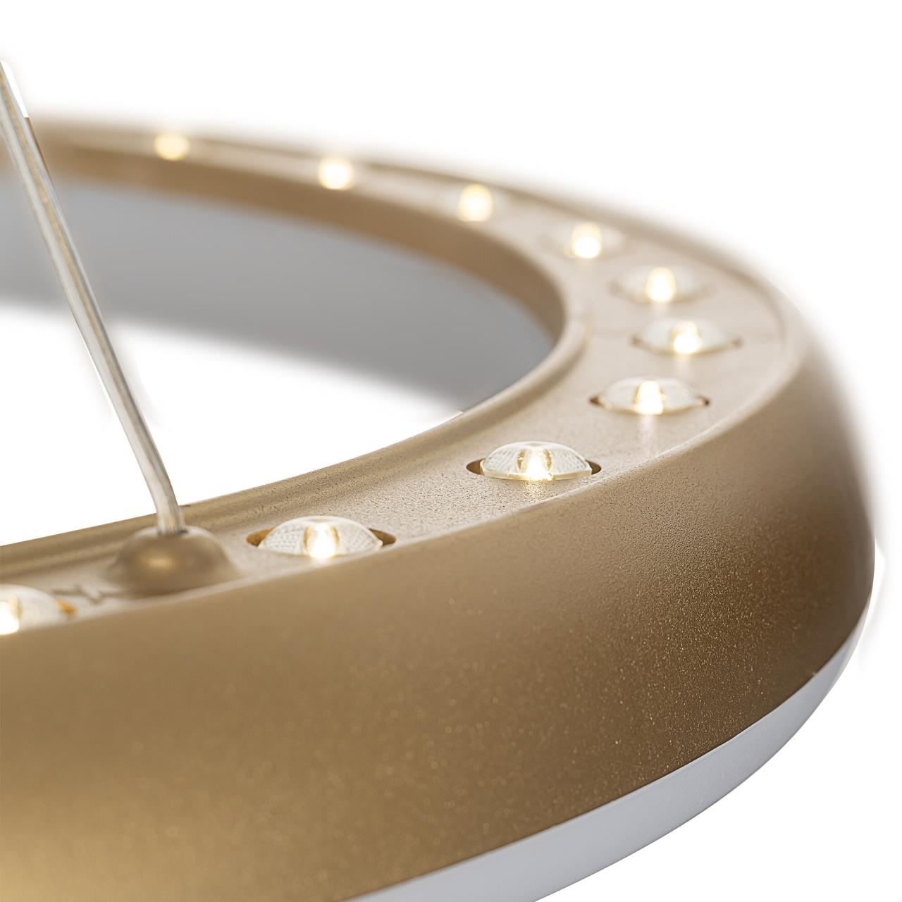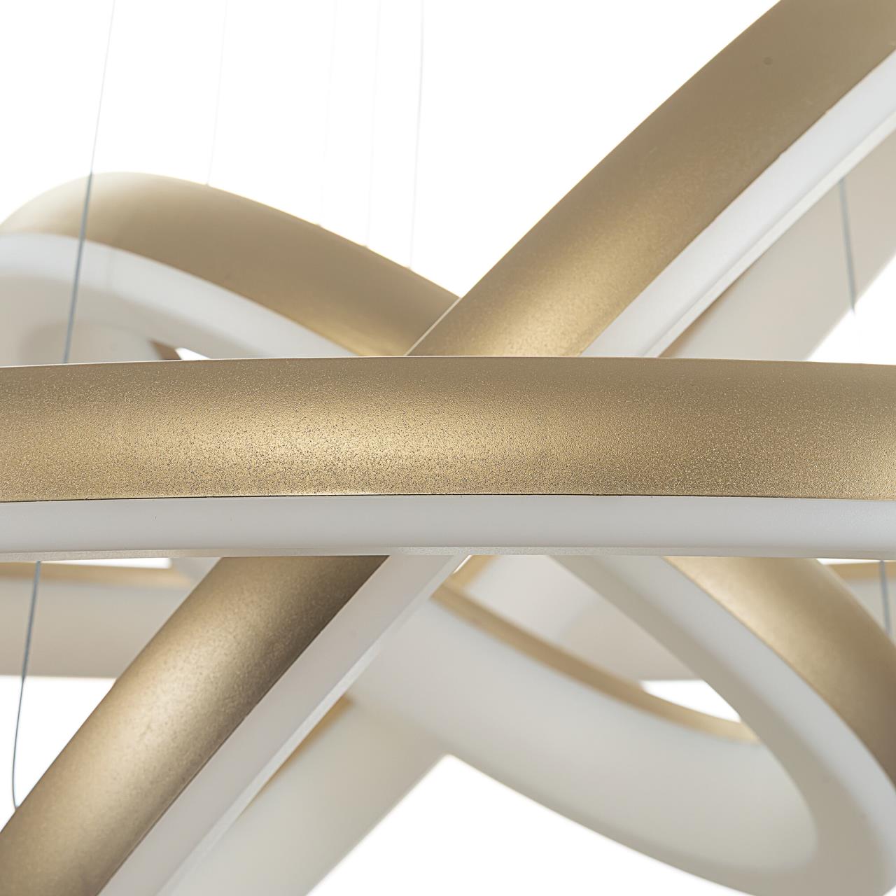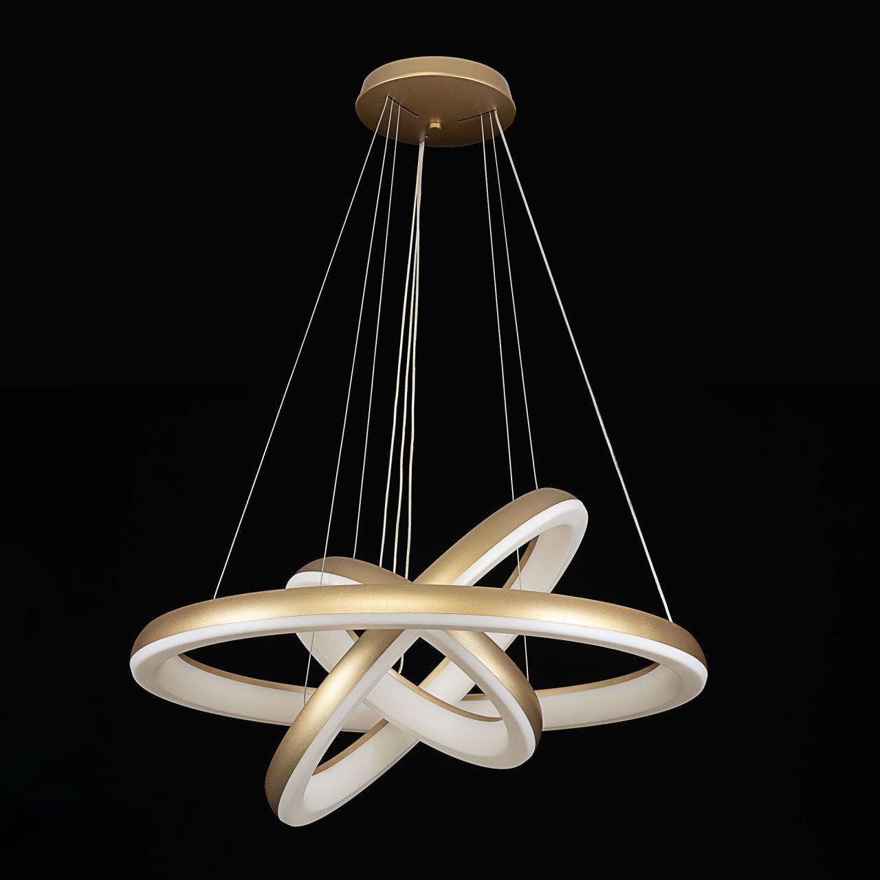 Люстра на тросах в форме каскада из трех подвесных колец, высоту и угол наклона каждого из которых можно изменить. Корпус изготовлен из прочного полимера золотистого оттенка, рассеиватель — оптический полимер. Крепление люстры подходит для всех типов потолков, в том числе натяжных. Тип крепления — планка. Суммарная мощность светильника 170Вт, световой поток 12500Лм.
