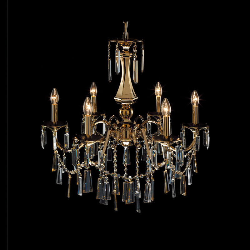 Люстра с комбинированным металлическим основанием, покрытым золотом в 24 карата. Подвески из хрусталя цвета латуни. Дизайн ламп в виде свечей, они выполняют функцию плафонов. Расположенные на разных уровнях лампы помогают создать объемный свет в помещении. Крепление осуществляется на крюк. Можно изменять высоту за счет укорочения цепи. Подойдет для просторных помещений с высокими потолками.