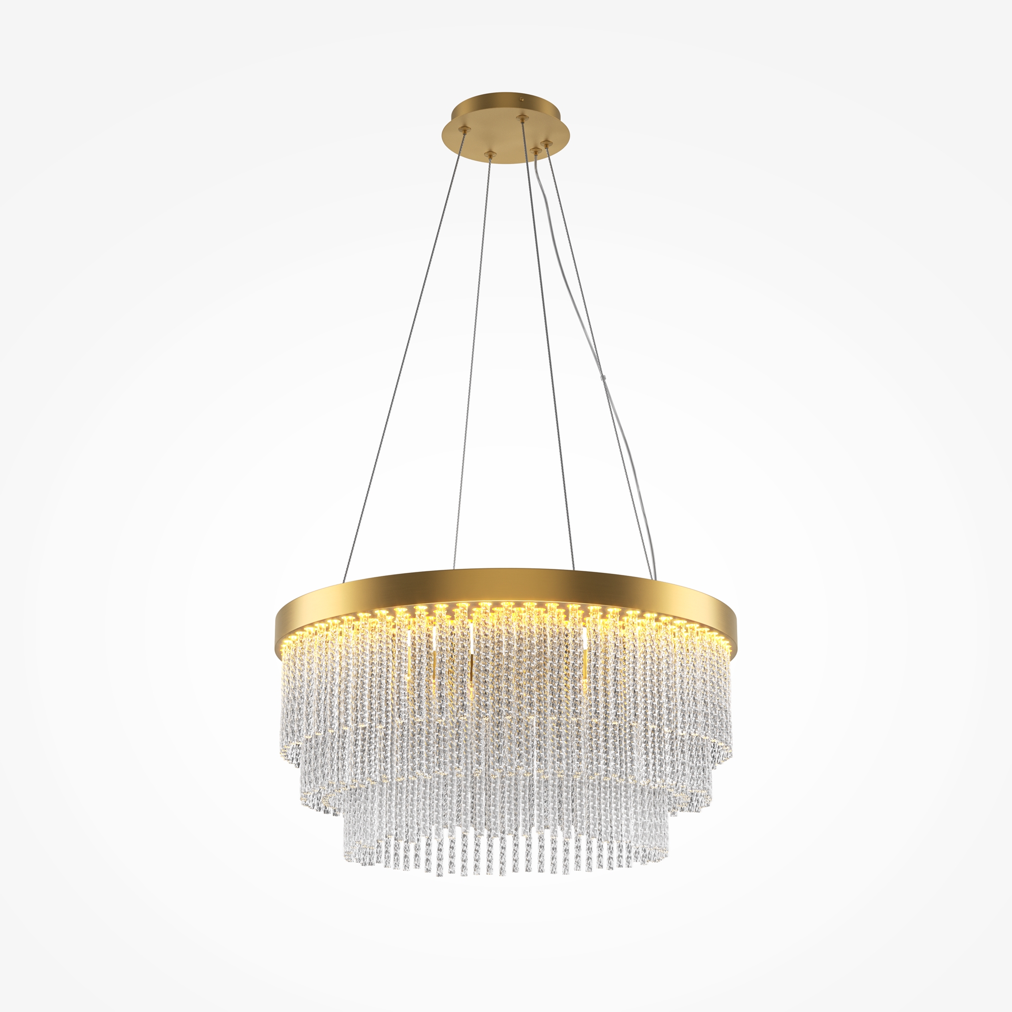 Арматура выполнена из металла в цвете латуни с легким мерцающим финишем. Декоративные элементы: стеклянные трубочки с витиеватым орнаментом, игриво переотражающим свет. Встроенный LED-источник, создающий свет достаточный для основного освещения. Трехступенчатый переключатель позволяет выбирать цветовую температуру: 2700K, 3000K или 4000K. Высота светильника регулируется, максимальная высота - 3300 мм. Высокий индекс цветопередачи CRI >90. Создает изысканное освещение с игрой бликов и переотражений.