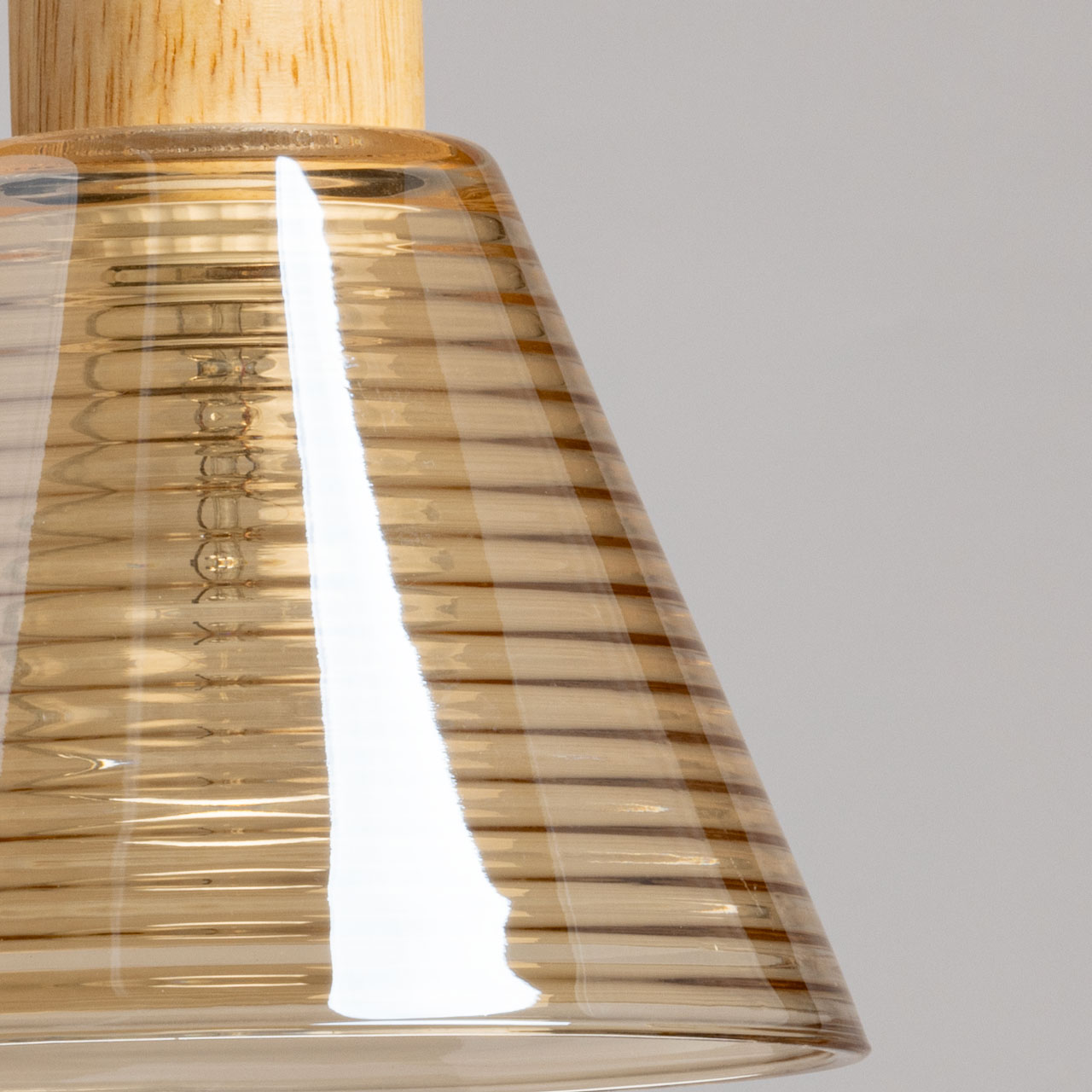 Основание подвеса выполнено из металла с имитацией под натуральное дерево светлого цвета. Стеклянный плафон, гальванизирован в цвет шампань с линейным рисунком отлит в форму.