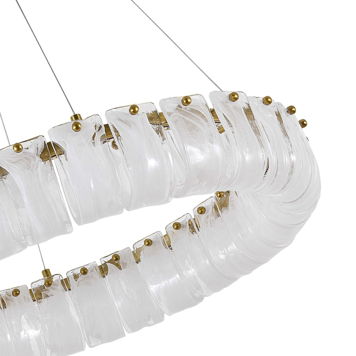 Подвесной светильник Delight Collection 82004P/D800 brass в виде кольца с расположенными по периметру декоративными элементами. Каждый элемент имеет U-образную форму и выполнен из полупрозрачного стекла. Металлические части с отделкой латунь.