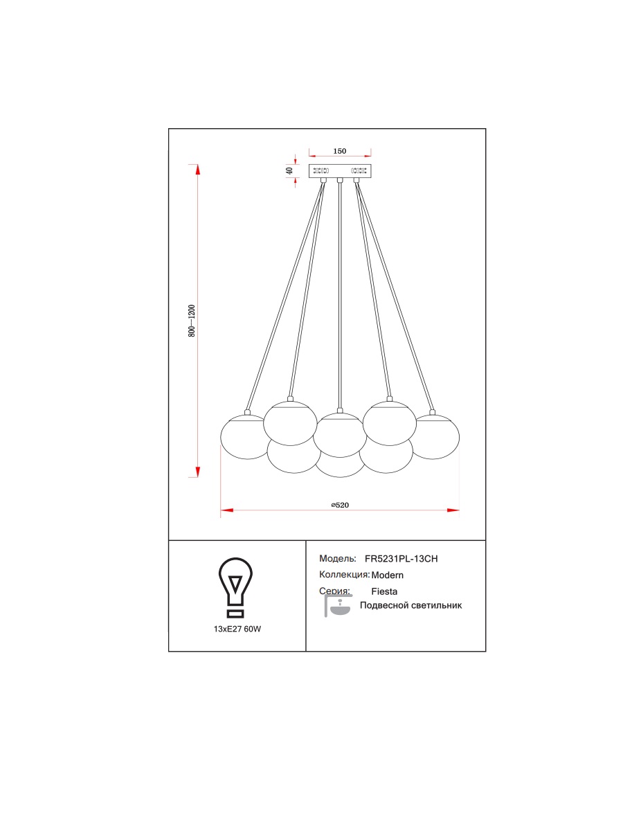 Осветительный прибор Fiesta FR5231PL-13CH оснащен 13 источниками света с типом цоколя Е27 и мощностью 60 Вт каждая, при этом общая мощность устройства составляет 780 Вт, что позволяет создать комфортное освещение в вашем интерьерном пространстве.