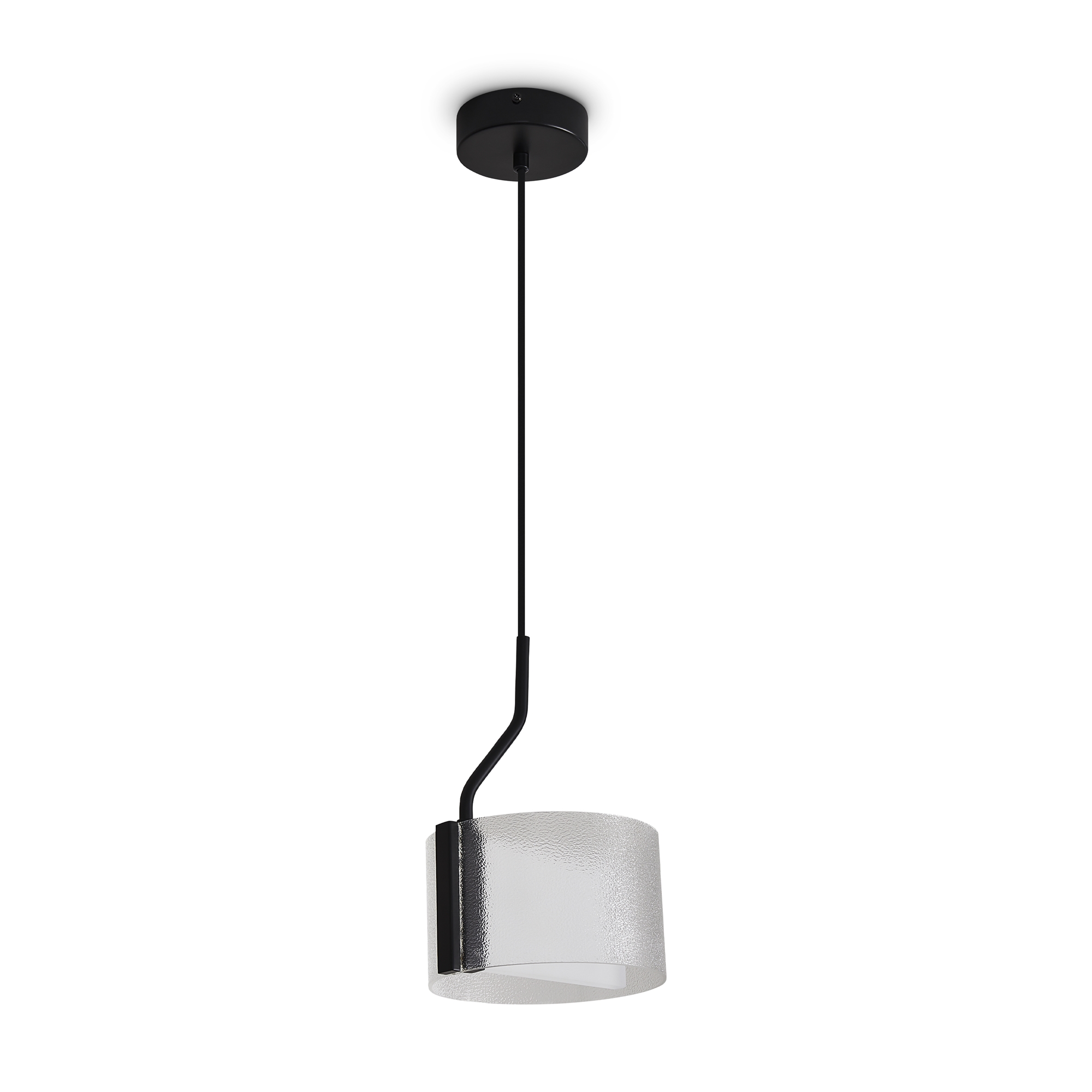 Материал арматуры — металл, цвет — черный. Потолочный, настенный и подвесной светильники оснащены LED-источниками света. Цветовая температура 3000К. Прозрачный рельефный плафон «парящий в воздухе» с эффектом замороженного стекла. Подходит для интерьеров в стиле минимализм и лайт лофт.