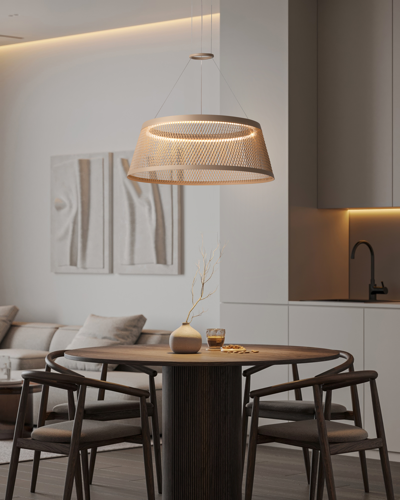 Материал арматуры — металл, цвет — Серо-бежевый. Подвесной светильник оснащен LED-источником света с цветовой температурой 3000К. Сетчатый металлический плафон создает оригинальный световой рисунок. Особенность серии — окраска в актуальные оттенки, включая серо-бежевый (RAL 1019), что позволяет создавать гармоничные цветовые решения в современном интерьере.