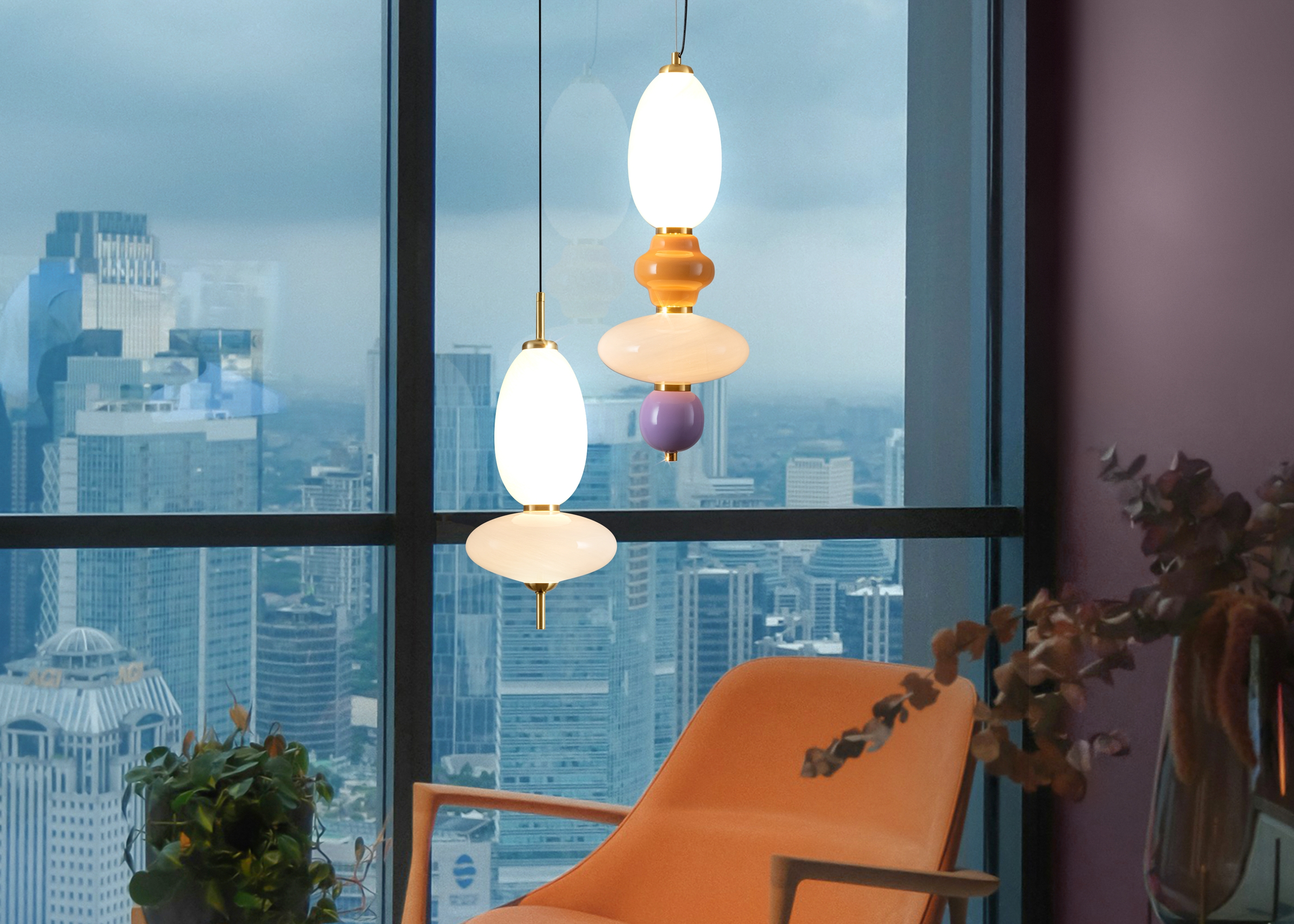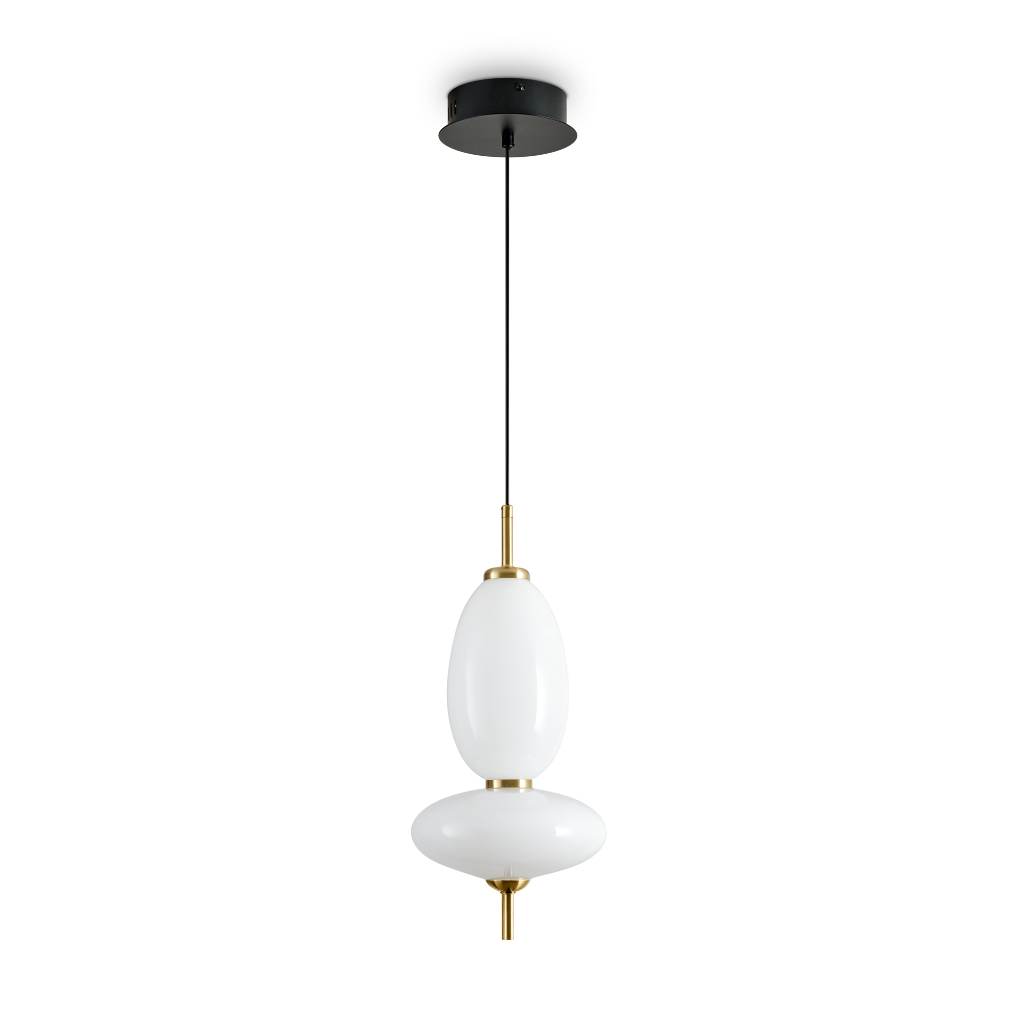 Металлическая арматура черного цвета. Глянцевые белые стеклянные плафоны с перламутровым рисунком и керамическими цветными элементами. LED источник света. Два вида подвеса.