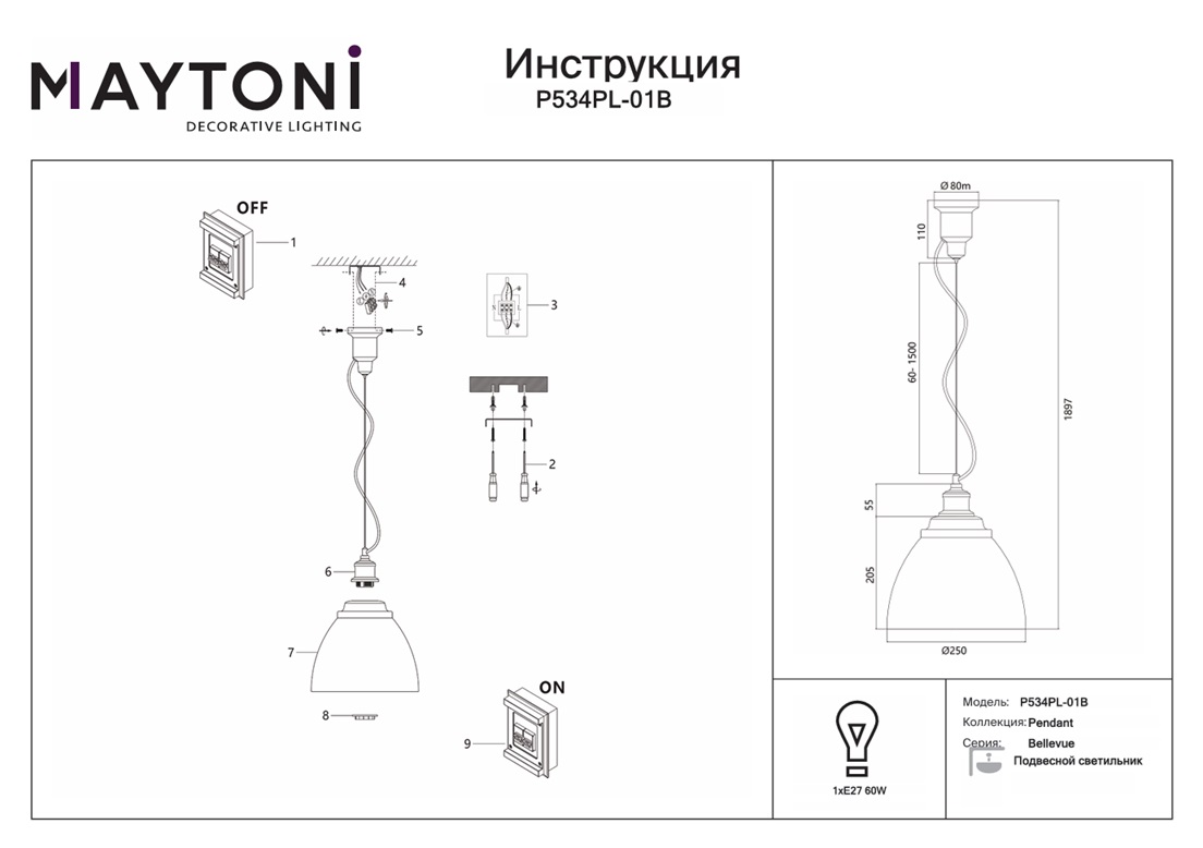 Подвесной светильник Maytoni Bellevue P534PL-01B — это модель, которая станет изюминкой в любом современном интерьере. Благодаря источнику света с типом цоколя E27 и мощностью 60 Вт, этот осветительный прибор обеспечивает комфортное и равномерное освещение на площади в 3 квадратных метра, создавая уютную атмосферу в вашем доме. Арматура и плафоны светильников изготовлены из металла в черном цвете. Порошковое окрашивание с эффектом муара делает поверхность устройства еще более привлекательной. Цветовые решения коллекции: белый, серый и черный. Размеры устройства составляют 250 мм х 205 мм, что позволяет легко интегрировать его в любое интерьерное пространство. Технической особенностью является регулировка по высоте в диапазоне от 400 мм до 1897 мм, что дает возможность, изменяя длину шнура, создавать эффектные инсталляции, располагая подвесы разного размера серии Bellevue P534PL на разной высоте. Гарантия от производителя составляет 2 года. Способ крепления светильника к потолку на планку позволяет быстро и просто осуществить монтаж, при этом подходит для всех типов потолков, в том числе и натяжных. Стильный дизайн, тип подвеса на трос и техника окрашивания муар подвесного светильника Maytoni Bellevue P534PL-01B делают его особенным элементом декора, который украсит любое интерьерное пространство.