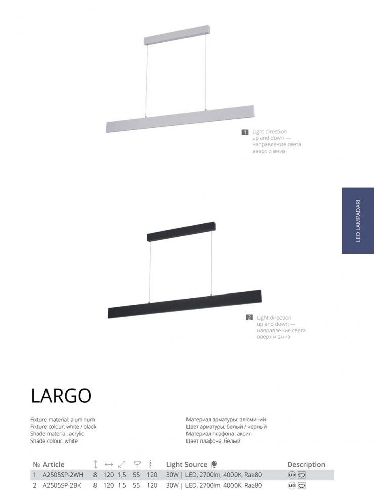Подвесной светодиодный светильник Arte Lamp A2505SP-2WH, входящий в серию LARGO, отлично подойдет для освещения пространства на кухне, в гардеробной, в прихожей, в офисе, в баре, кафе и ресторане, оформленных в современном стиле или в стиле Минимализм. Данный светильник имеет один длинный прямоугольный плафон в форме призмы белого цвета с белым рассеивателем, выполненным из силикона и направленный вниз, а также белую арматуру, изготовленную из металла. Итальянский производитель Arte Lamp дает гарантию на свое изделие 1 год и обращает внимание на то, что осветительный элемент с цоколем LED встроен в конструкцию и не требует приобретения дополнительных лампочек, а общая мощность светильника составляет 30 Вт, что эквивалентно лампе накаливания мощностью 220 Вт и позволяет осветить помещение площадью 8 кв. м. Технической особенностью этого осветительного прибора является возможность регулировки по высоте, при этом максимальная высота подвесного светильника может достигать 128 см. Способ крепления светильника к потолку на планку позволяет быстро и просто осуществить монтаж осветительного прибора, при этом подходит для всех типов потолков, в том числе и натяжных. Строгий дизайн, матовая белая поверхность и необычная форма подвесного светодиодного светильника Arte Lamp A2505SP-2WH делают его особенным элементом декора, который украсит любое интерьерное пространство.