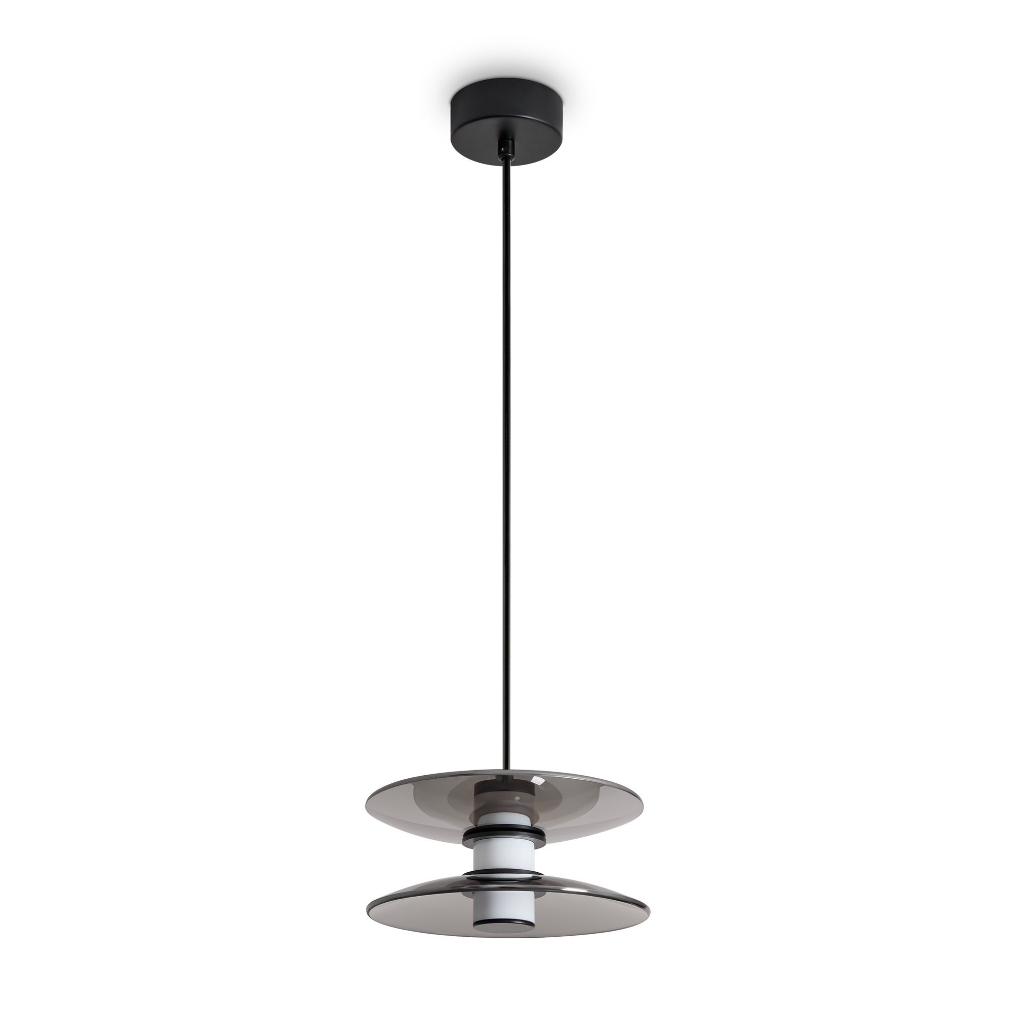Материал арматуры — металл, цвет — черный. Плафоны выполнены из стекла дымчатого цвета. Светильники представлены в подвесном и напольном исполнении и оснащены LED-источником света с цветовой температурой 3000К. Сочетание металла и затемненного стекла создает выразительную атмосферу в современных интерьерах таких как минимализм и лофт.
