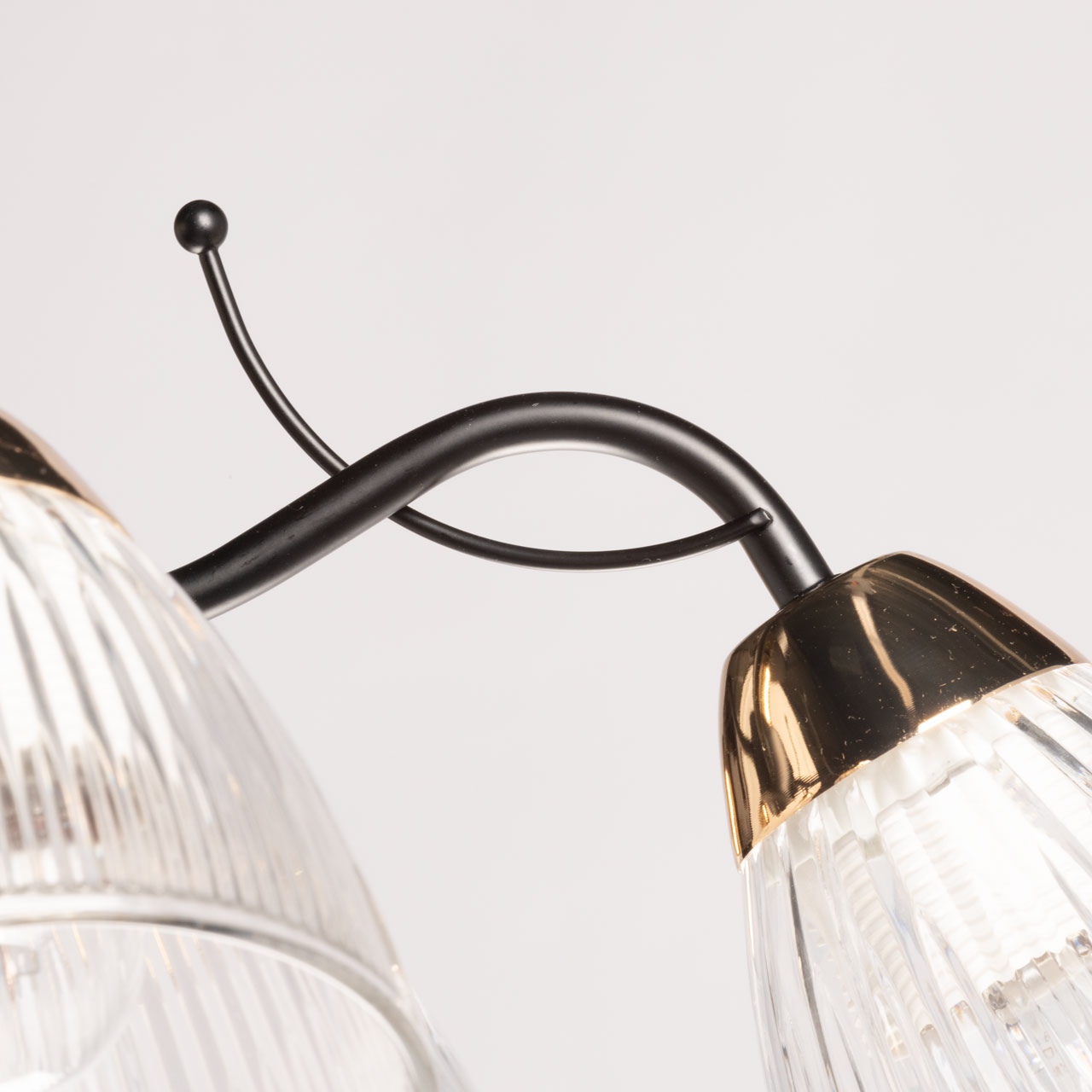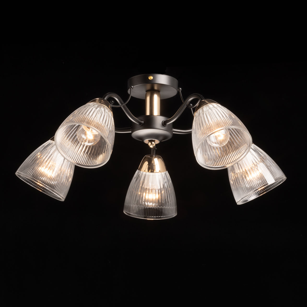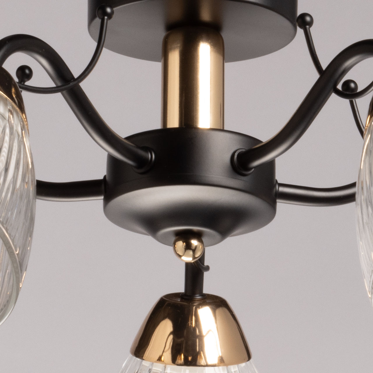 Металлическое основание потолочной люстры окрашено в черный цвет. Отдельные элементы основания гальванизированы в цвет французского золота. Люстра декорирована плафонами из прозрачного фактурного стекла.