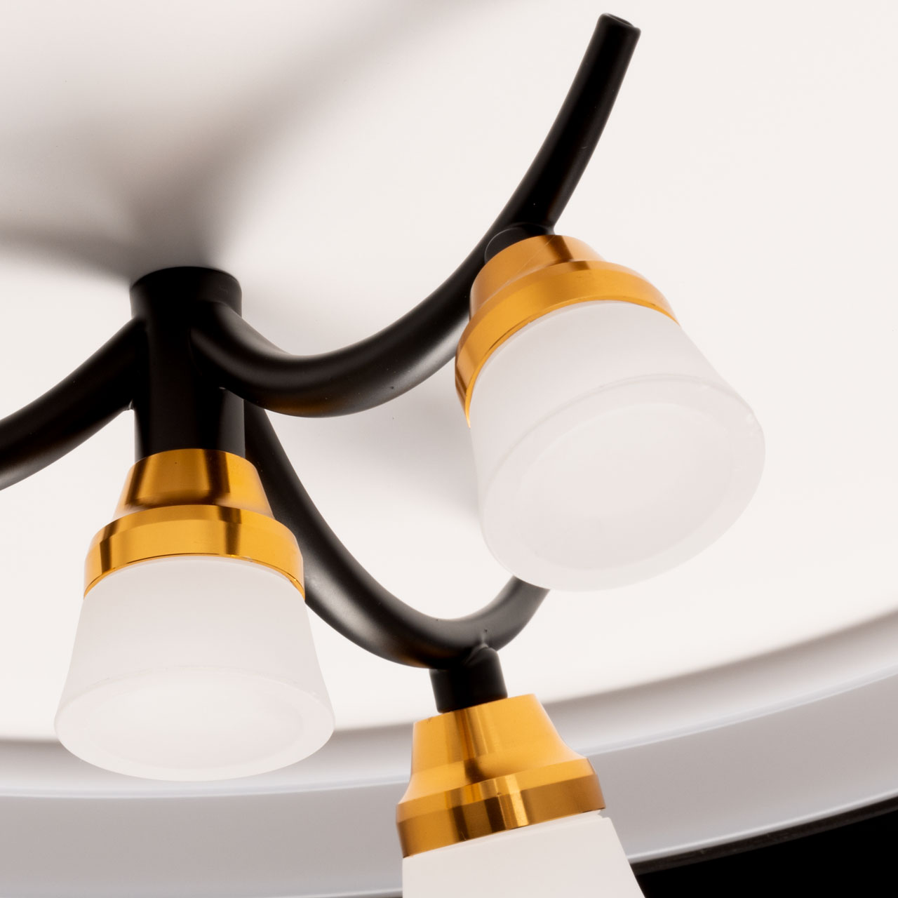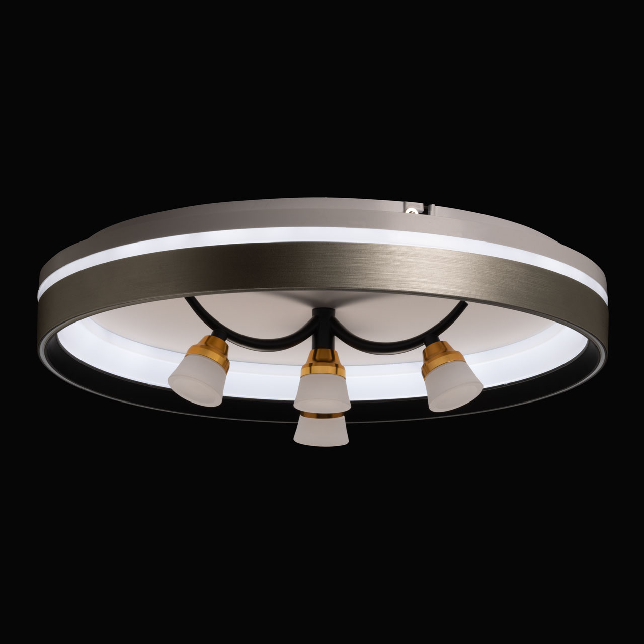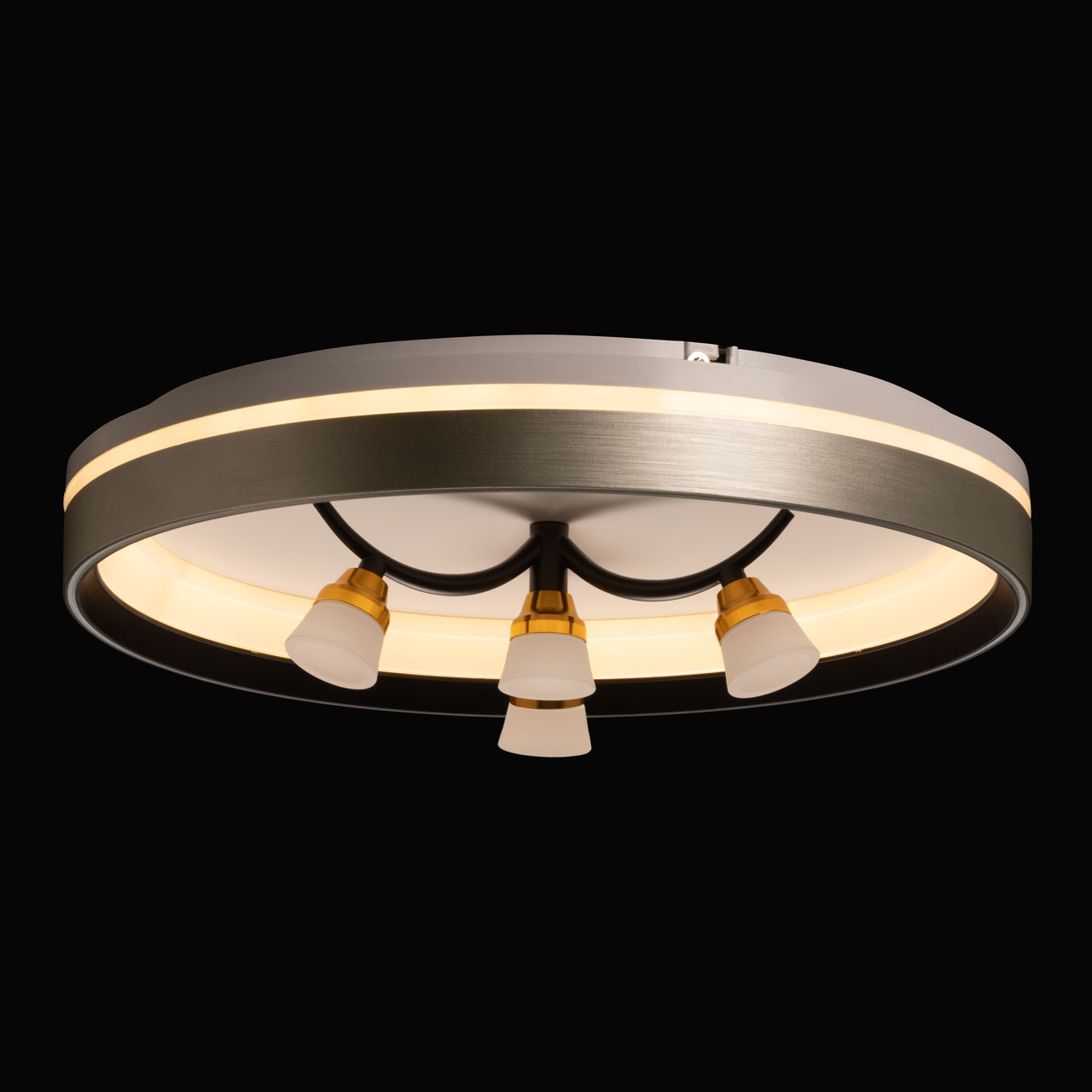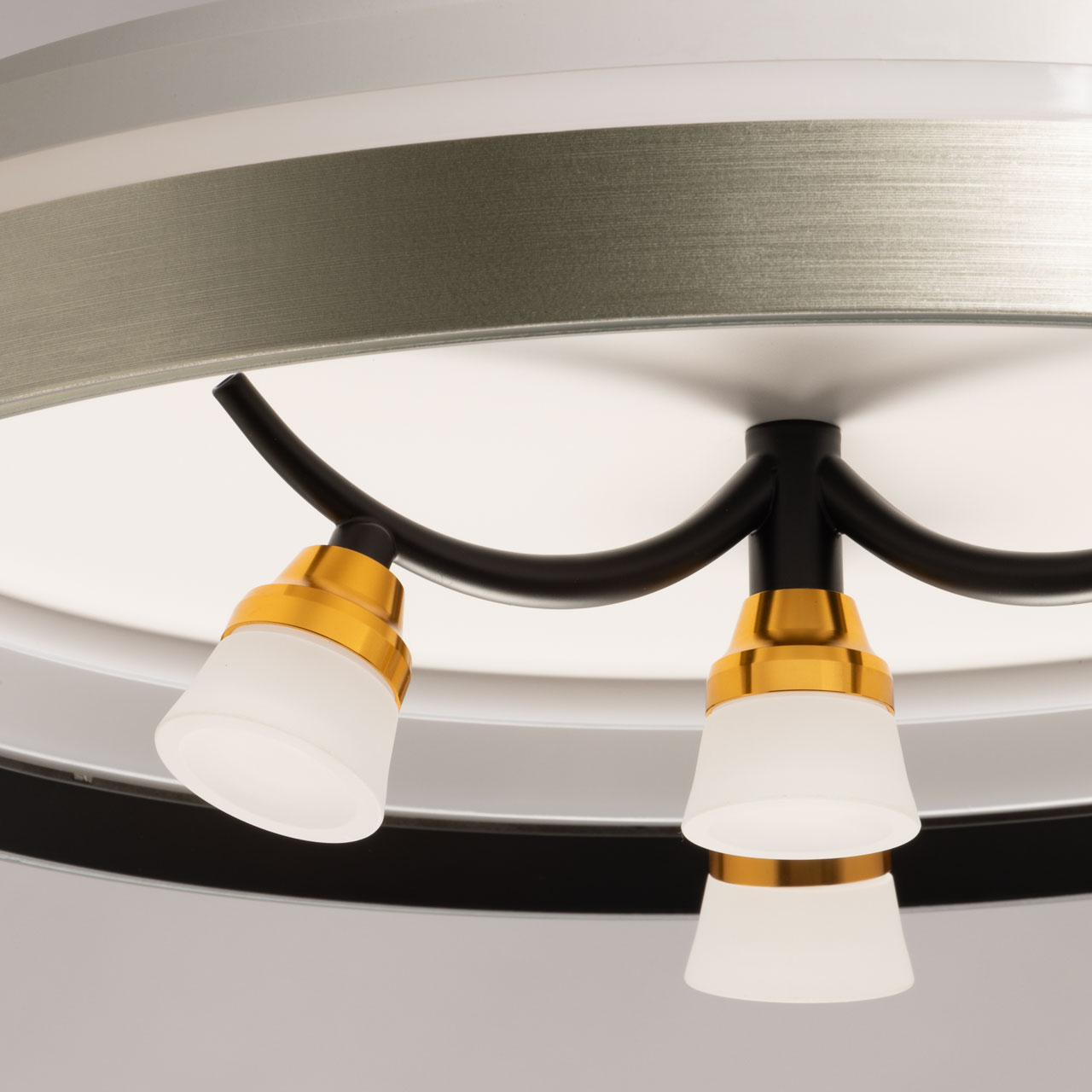 Металлическое основание потолочной люстры окрашено в белый цвет. Корпус плафона выполнен из сплава алюминия и окрашен с наружи в серый цвет, с внутренней стороны в черный цвет. Светодиодные источники света закрыты белым матовым акрилом. Рожки окрашены в черный цвет, держатели ламп гальванизированы в цвет золота.