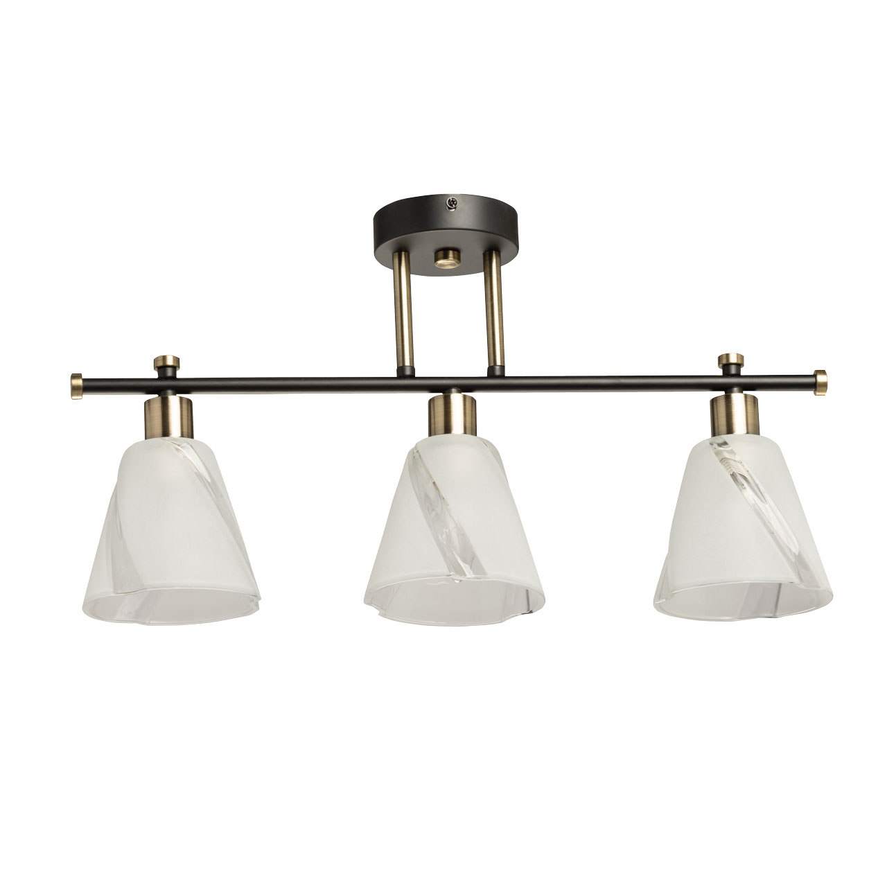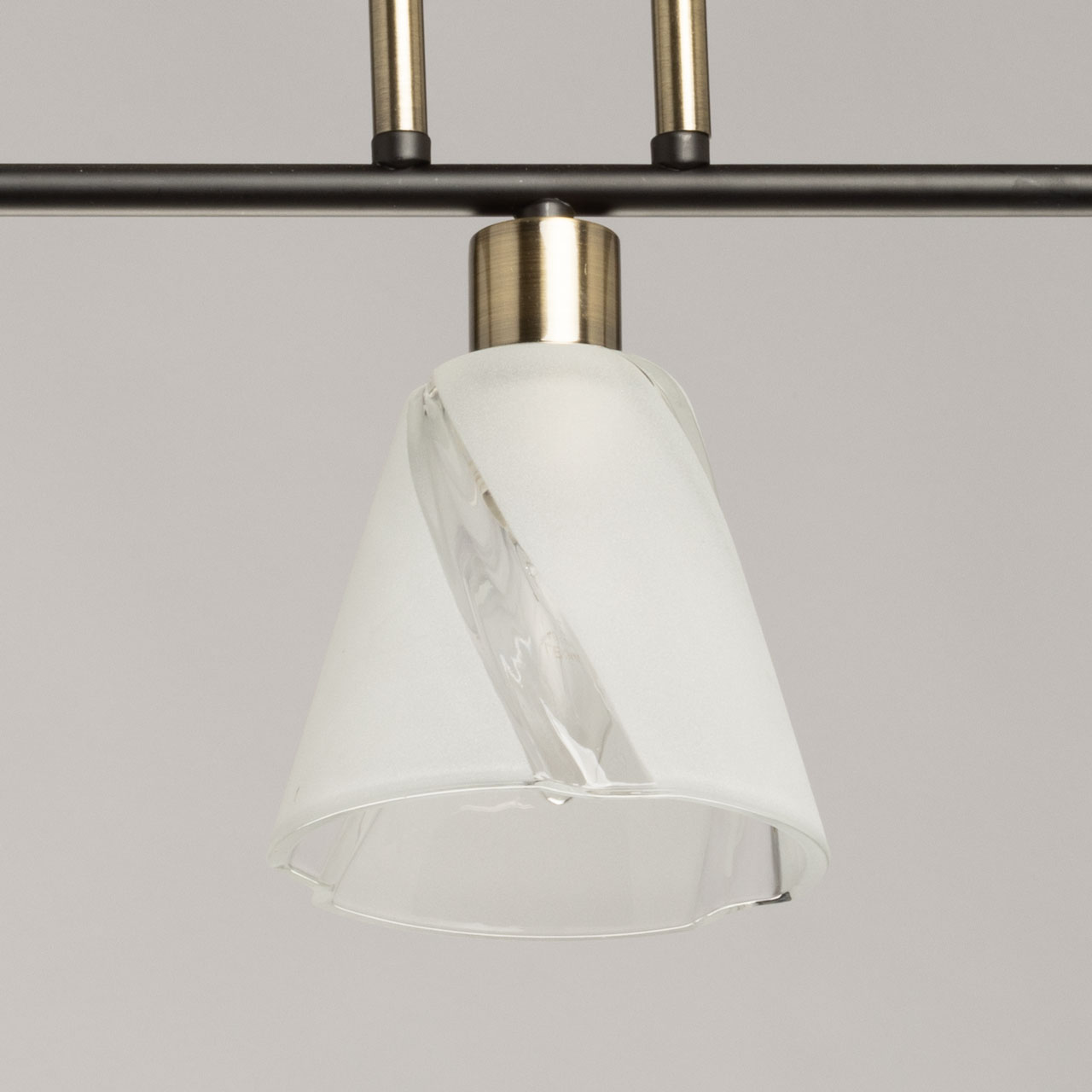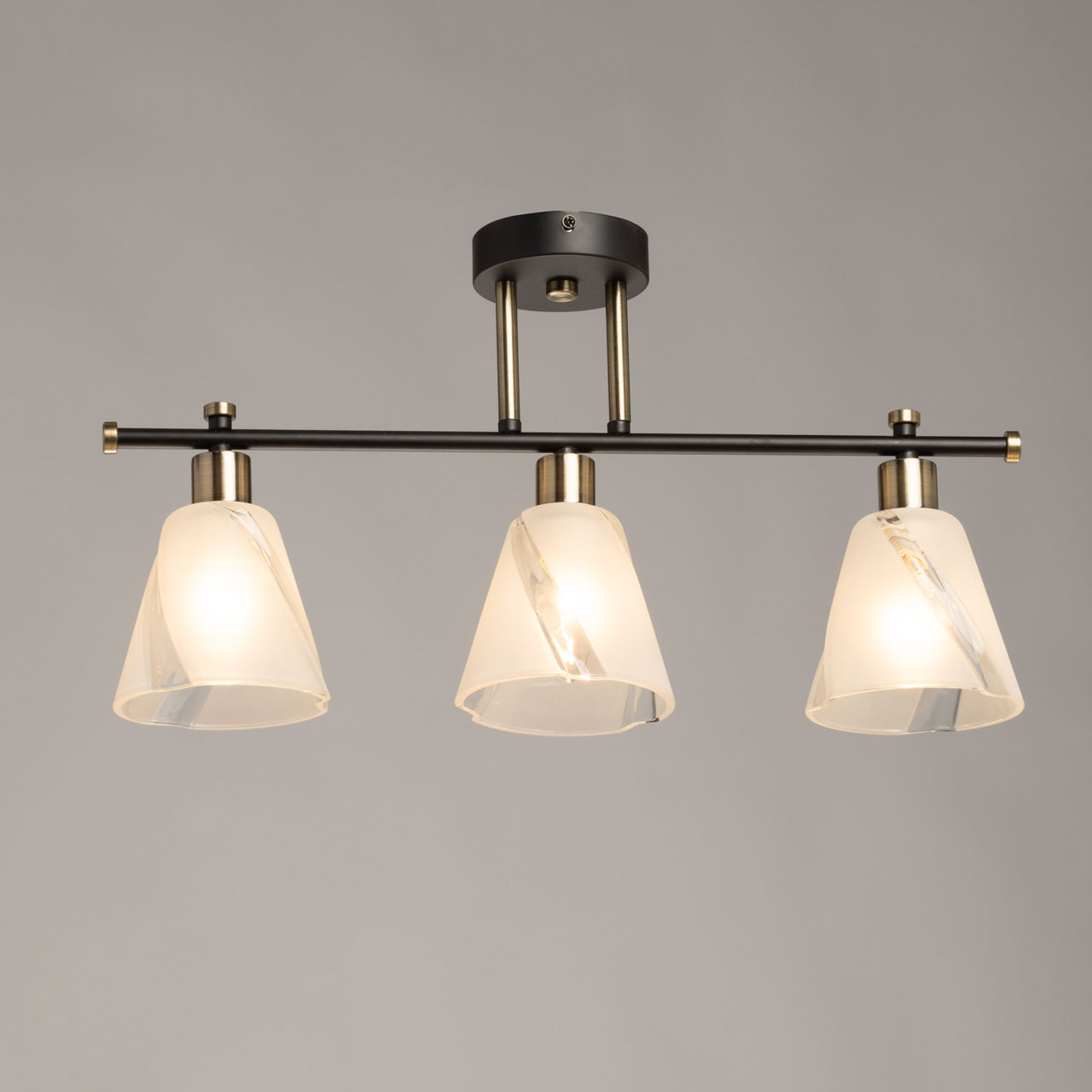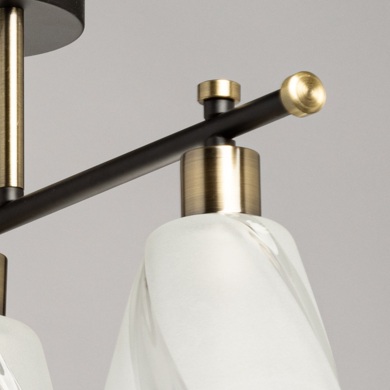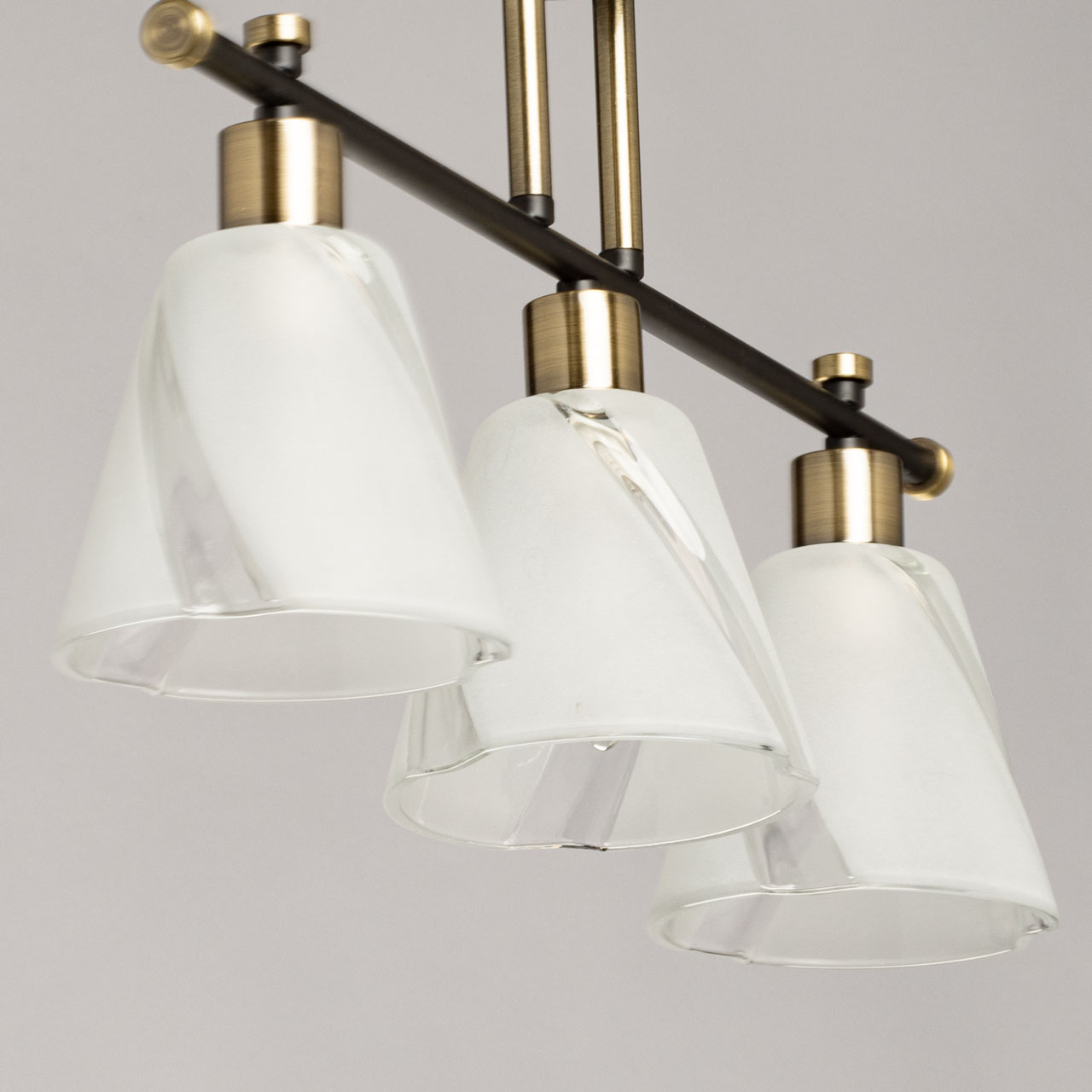 Основание светильника выполнено из металла и окрашено в черный цвет. Отдельные элементы основания гальванизированы в цвет античной бронзы. Стеклянные плафоны отлиты в сложную форму и матированы в белый цвет.