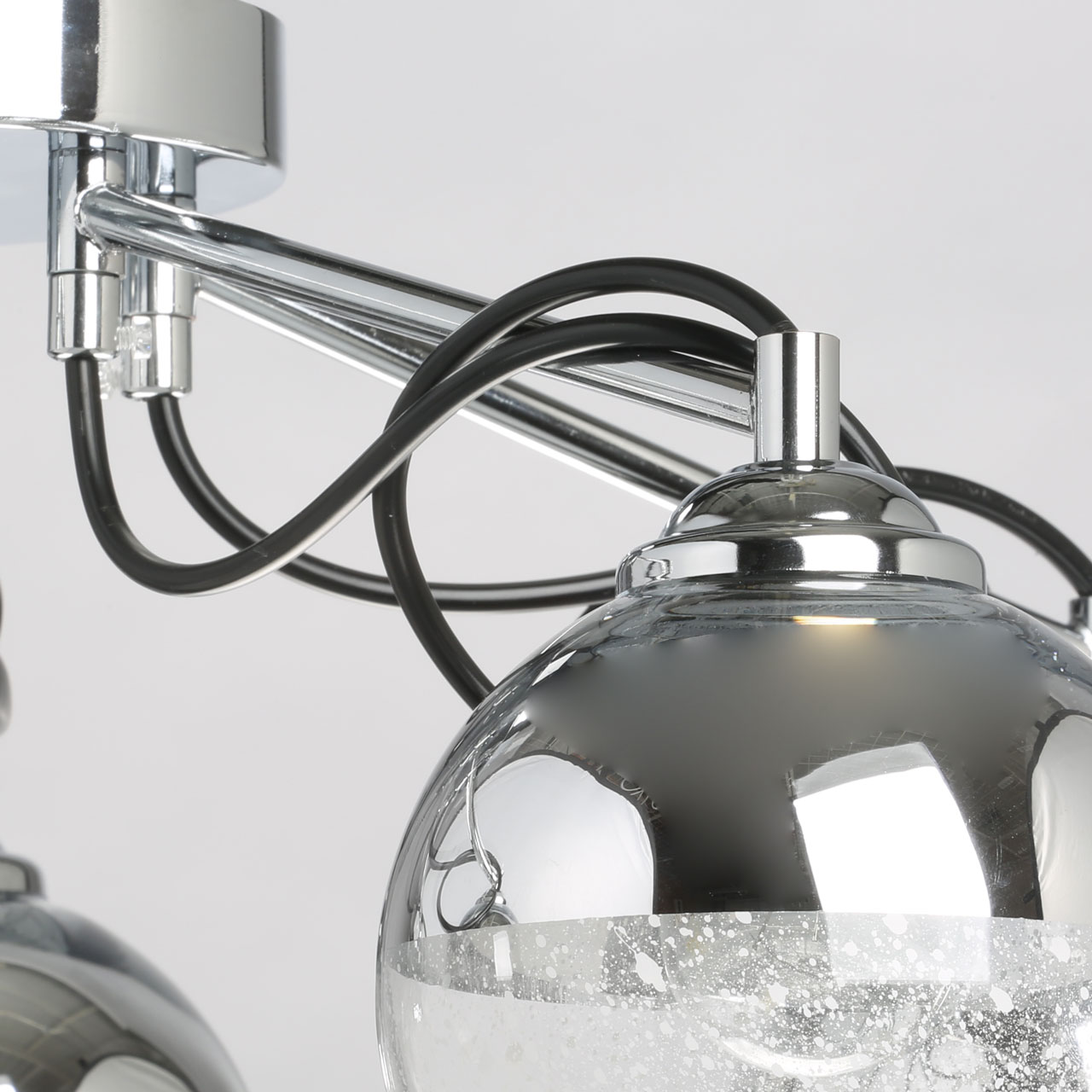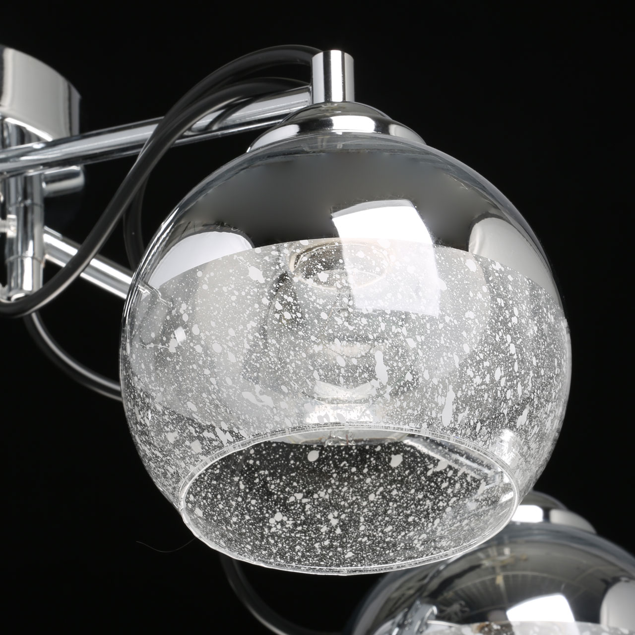 Основание изготовлено из металла и хромировано. На прямых, глянцевых рожках закреплены плафоны-чаши с нестандартной гальванизацией. Стекло наполовину покрыто дымчатой краской, наполовину на прозрачный фон вручную в хаотичном порядке нанесены белые капли.