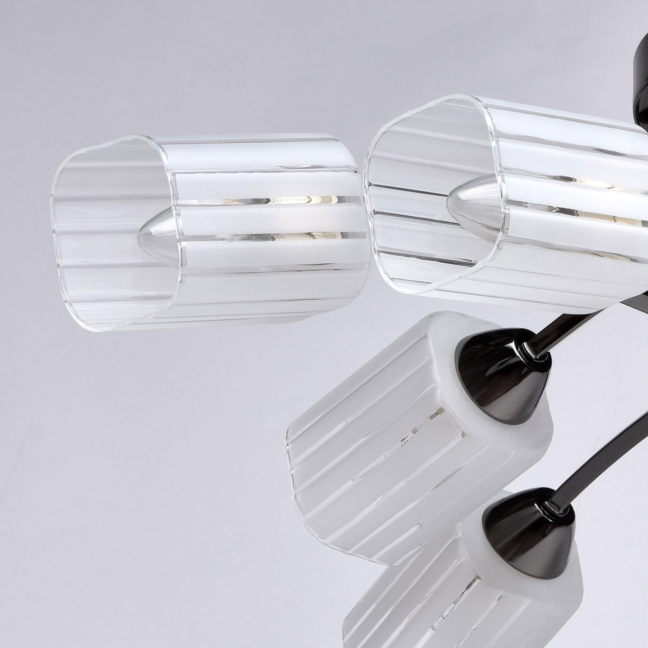 Основание светильника выполнено из металла и гальванизировано в цвет черного никеля. Потолочная чаша и держатели плафонов изготовлены по технологии обработки на токарном станке.Плафоны: стекло, отлито в форму. Плафоны матированы по трафарету.