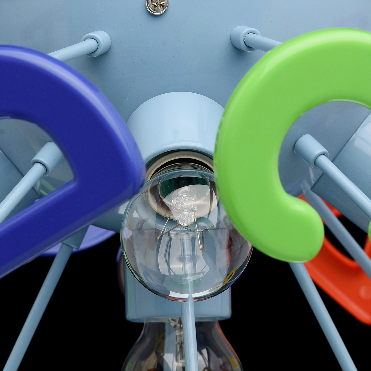 Основание светильника выполнено из сплава металла и окрашено в синий цвет. Светильник декорирован латинскими буквами из высококачественного акрила, окрашенного в разные цвета.