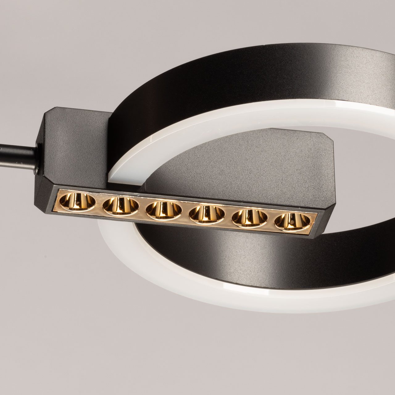 Металлическое основание подвесной люстры окрашено в черный цвет. Отдельные элементы основания гальванизированы в цвет золота. Корпус плафонов выполнен из сплава алюминия и окрашен в цвет основания. Светодиодные источники декоративного света закрыты матовым акрилом. Открытые функциональные точечные светодиоды углублены в корпус плафонов.