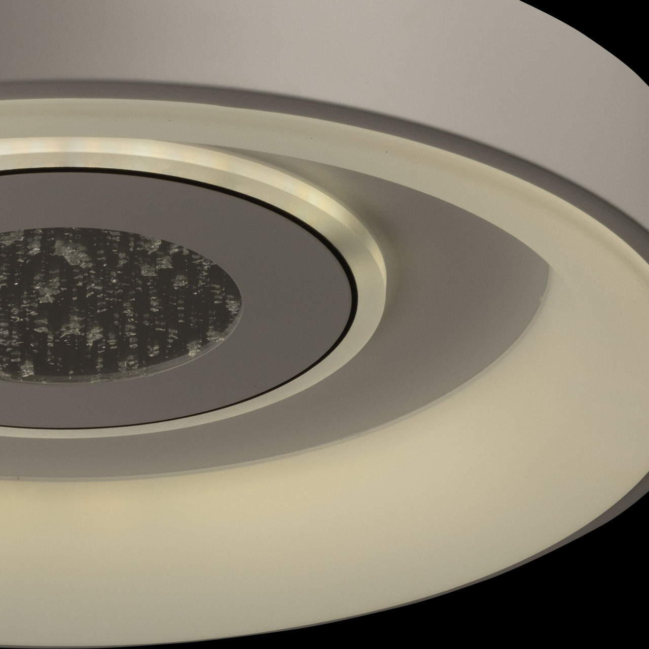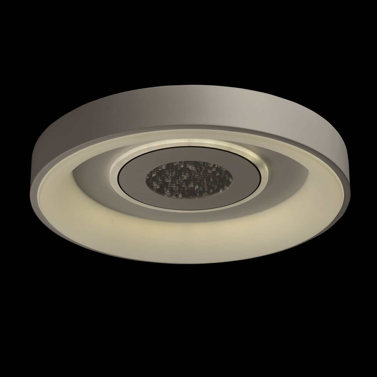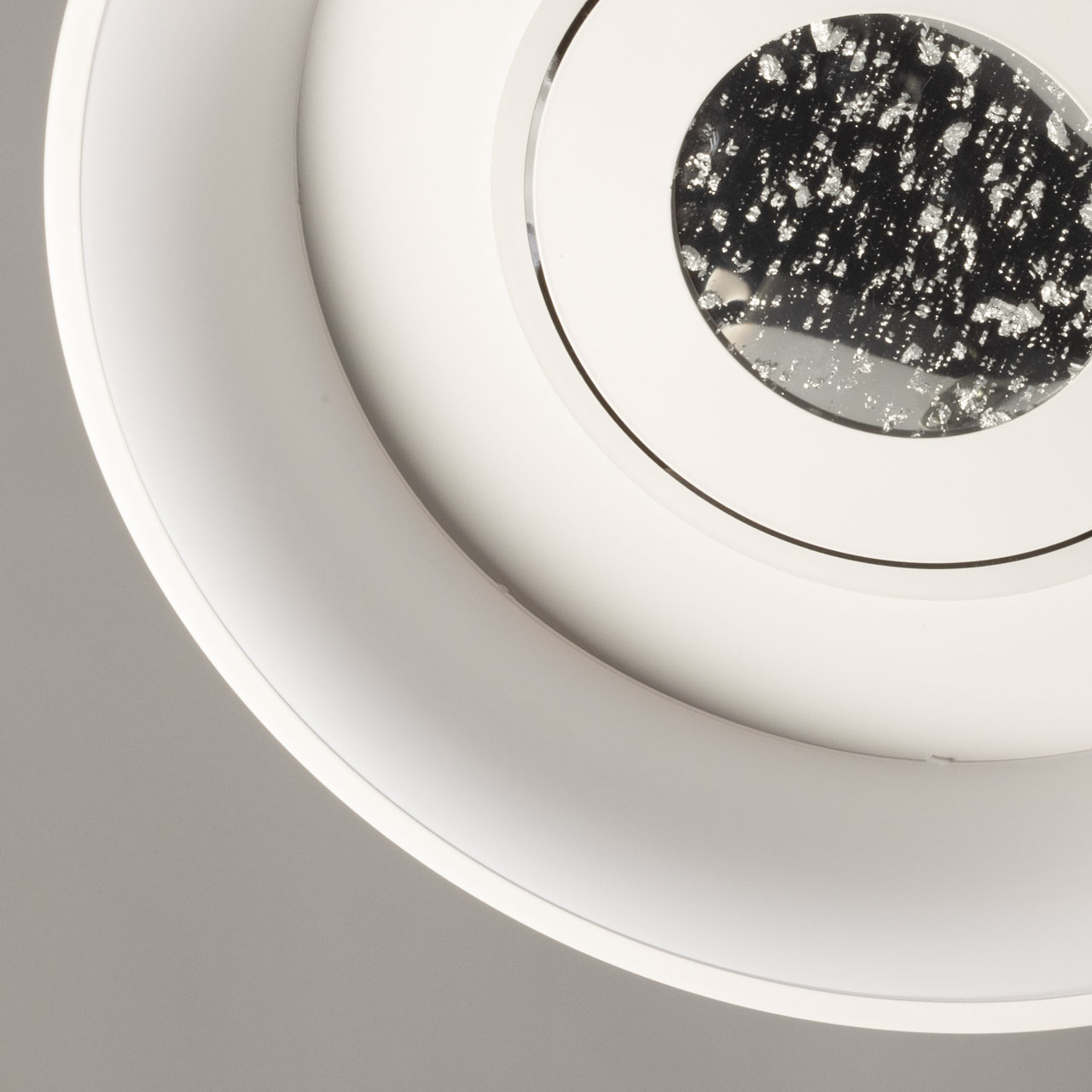 Металлическое основание потолочной люстры окрашено в белый цвет. Корпус плафона выполнен из сплава алюминия с цинком и окрашен в белый цвет. Светодиодные источники света закрыты матовым акрилом. Светильник декорирован пластиной, окрашенной в белый цвет с черным кантом, в центре пластины находится область с эффектом фольгирования цвета серебро.
