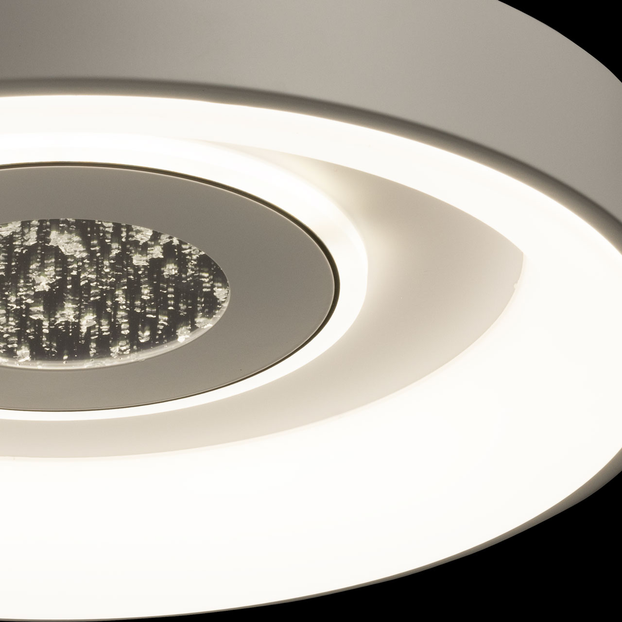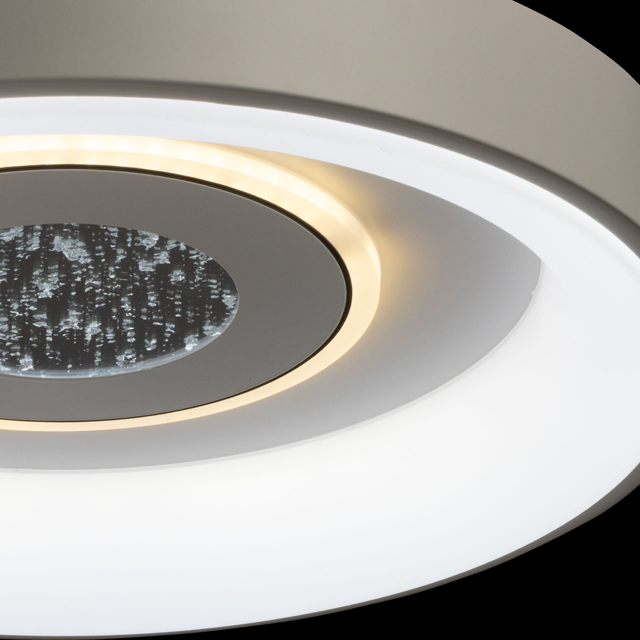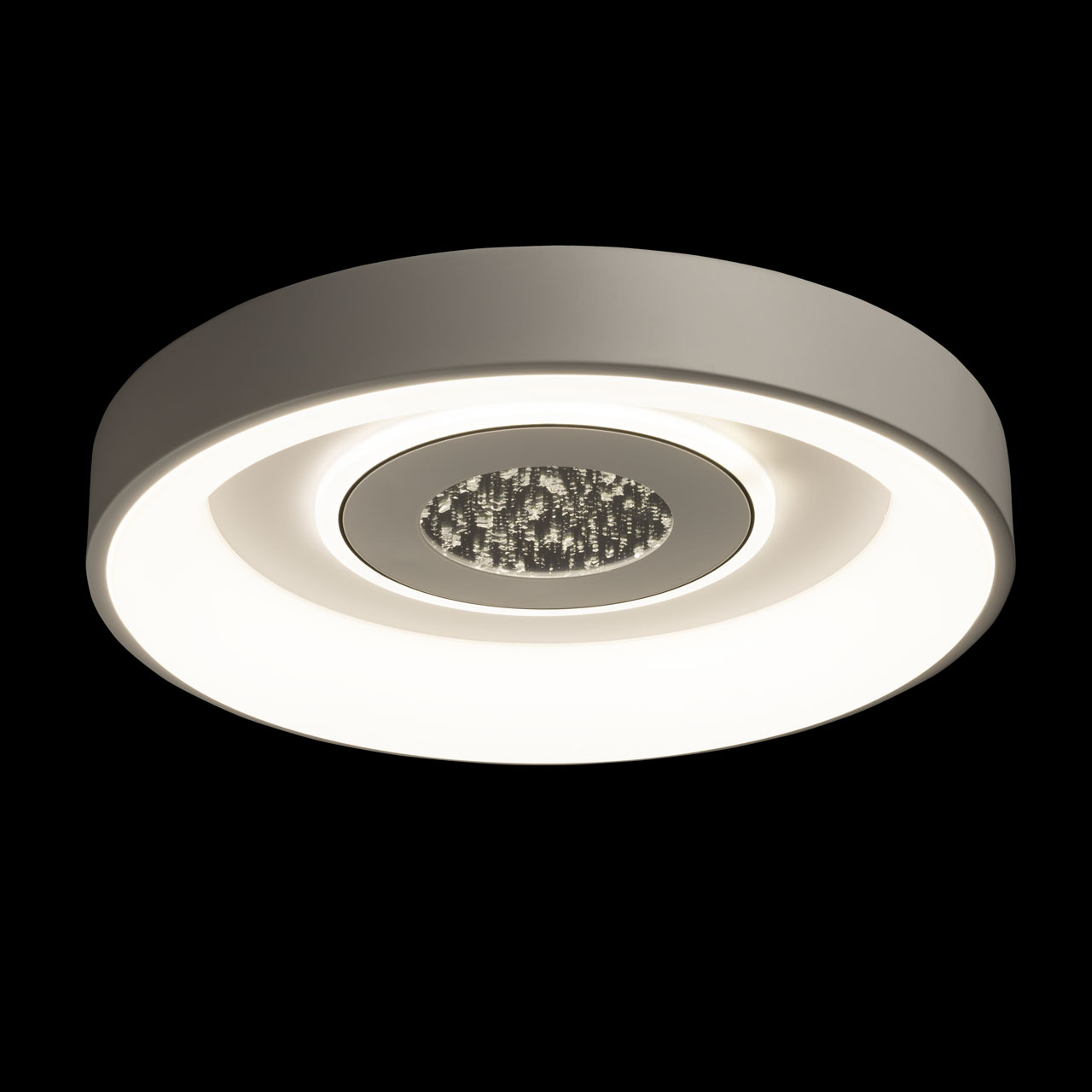 Металлическое основание потолочной люстры окрашено в белый цвет. Корпус плафона выполнен из сплава алюминия с цинком и окрашен в белый цвет. Светодиодные источники света закрыты матовым акрилом. Светильник декорирован пластиной, окрашенной в белый цвет с черным кантом, в центре пластины находится область с эффектом фольгирования цвета серебро.