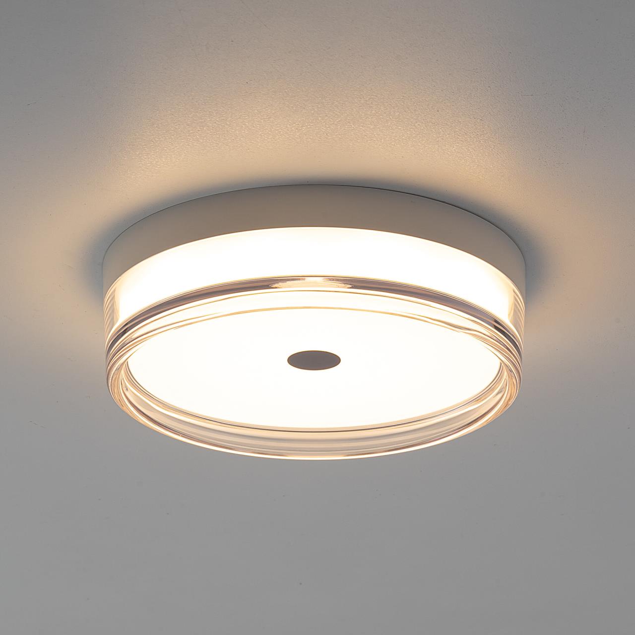 Корпус светильника изготовлен из высокопрочного полимера, рассеиватель — из оптического полимера, причем внешняя часть — прозрачная с глянцевой поверхностью, а внутри добавлена матовая вставка. Общий диаметр светильника — 23см. Источником света служат встроенные светодиоды, при установке вы можете выбрать температуру свечения (теплый, нейтральный или белый свет). Но в любом случае, свет не будет резать глаза и утомлять зрение, заливая пространство мягким потоком без мерцания и пульсаций.