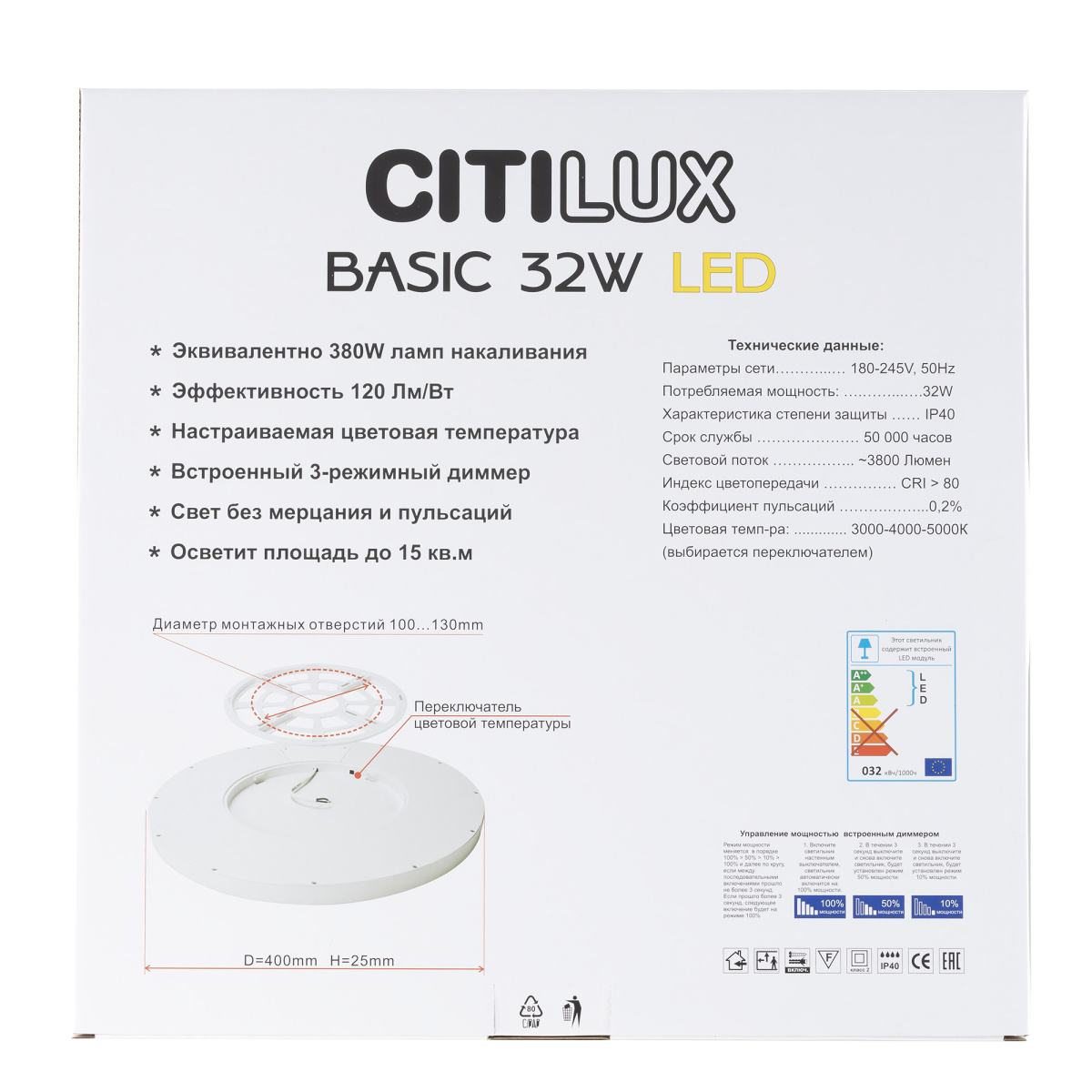 - Цветовая температура, K: 3000-4000-5000